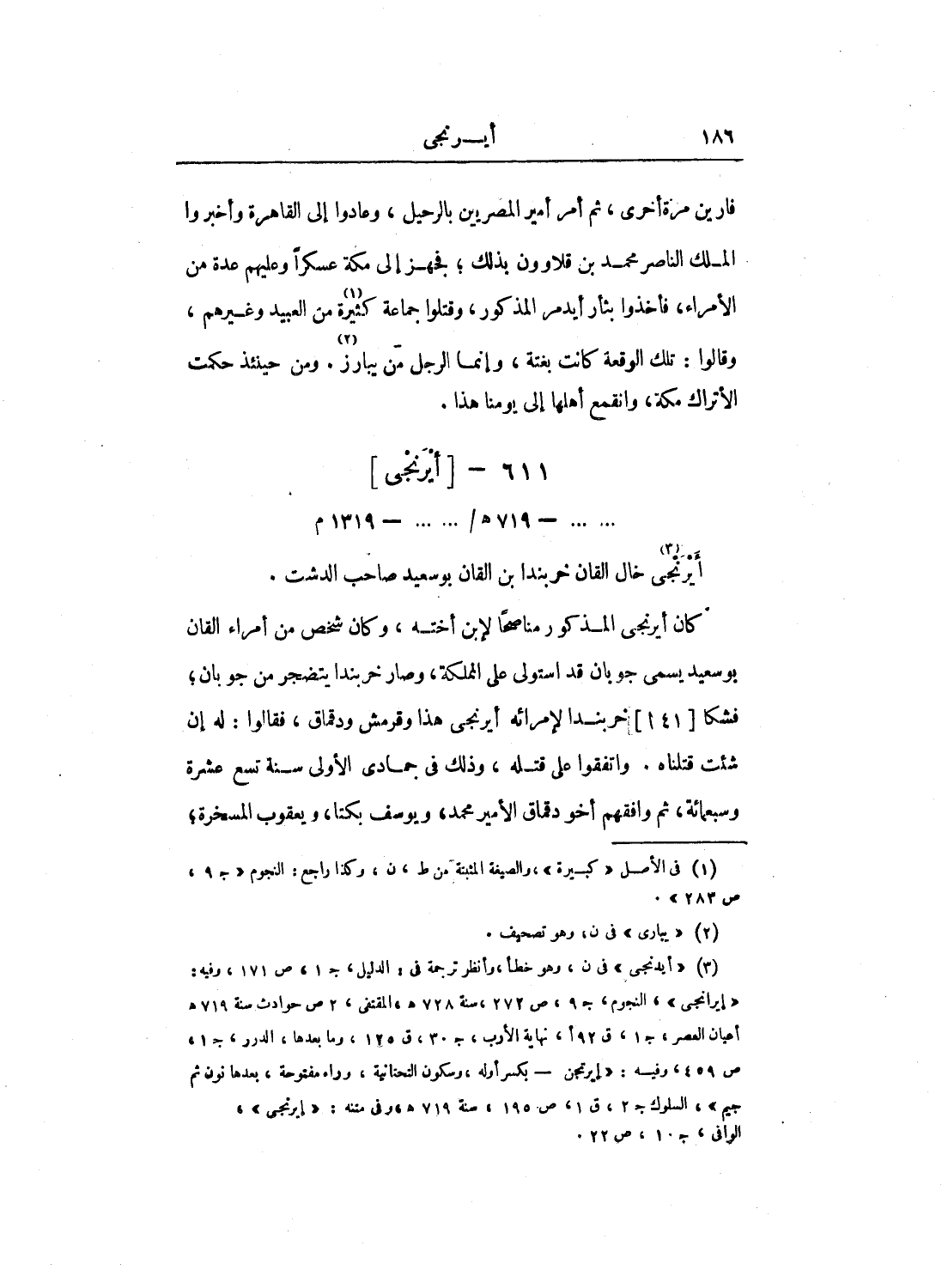 فارين مرة أخرى، ثم أمر أمير المصريين بالرحيل، وعادوا إلى القاهرة وأخبروا الملك الناصر محمد بن قلاوون بذلك؛ فجهز إلى مكة عسكراً وعليهم عدة من الأمراء، فأخذوا بثأر أيدمر المذكور، وقتلوا جماعة كثيرة من العبيد وغيرهم، وقالوا: تلك الوقعة كانت بغتة، وإنما الرجل من يبارز. ومن حينئذ حكمت الأتراك مكة، وانقمع أهلها إلى يومنا هذا.
