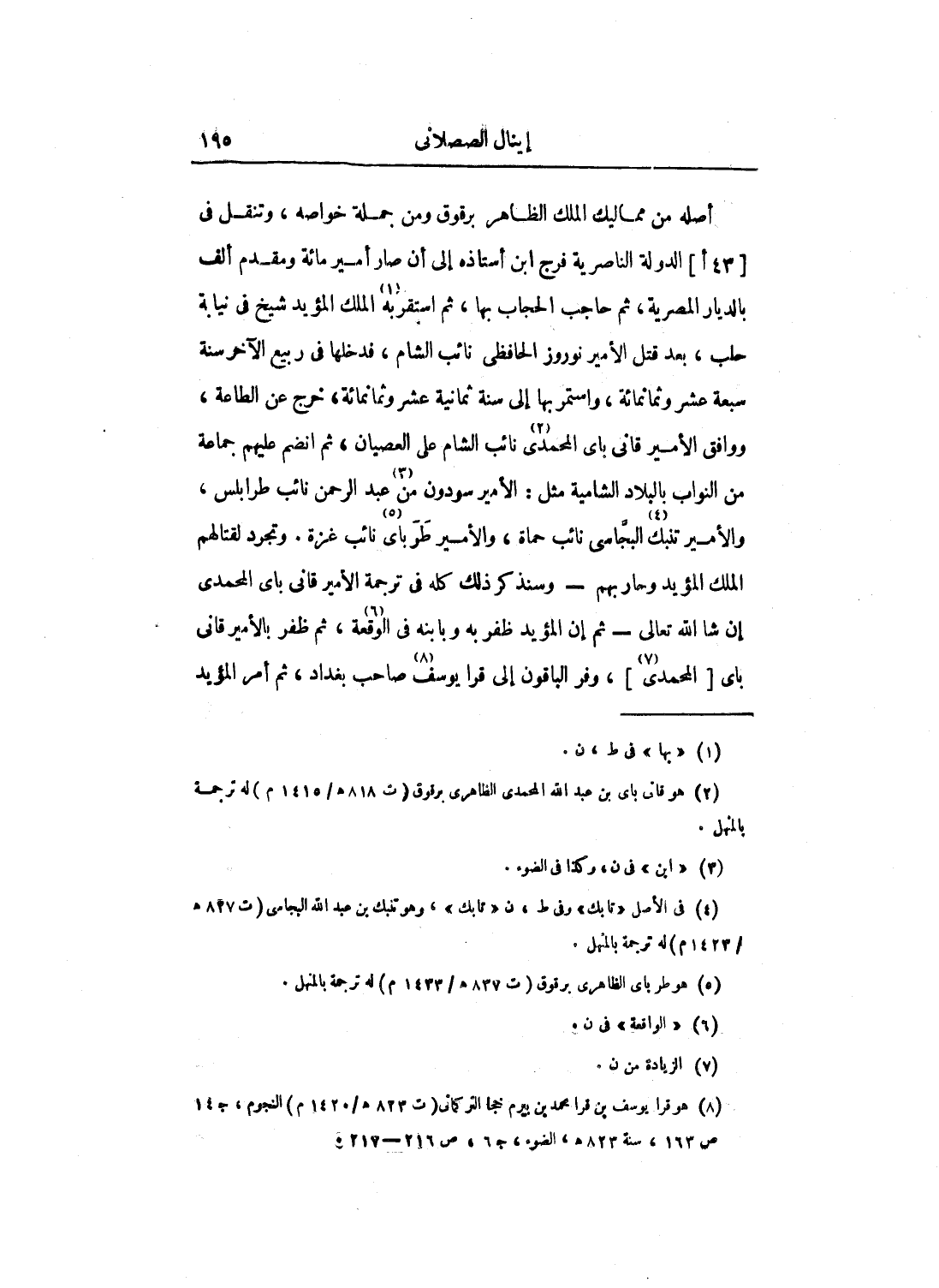 أصله من مماليك الملك الظاهر برقوق ومن جملة خواصه، وتنقل في الدولة الناصرية فرج ابن أستاذه إلى أن صار أمير مائة ومقدم ألف بالديار المصرية، ثم حاجب الحجاب بها، ثم استقر به الملك المؤيد شيخ في نيابة حلب، بعد قتل الأمير نوروز الحافظي نائب الشام، فدخلها في ربيع الآخر سنة سبعة عشر وثمانمائة، واستمر بها إلى سنة ثمانية عشر وثمانمائة، خرج عن الطاعة، ووافق الأمير قاني باي المحمدي نائب الشام على العصيان، ثم انضم عليهم جماعة من النواب بالبلاد الشامية مثل: الأمير سودون من عبد الرحمن نائب طرابلس، والأمير تنبك البجاسي نائب حماة، والأمير طرباي نائب غزة. وتجرد لقتالهم الملك المؤيد وحاربهم - وسنذكر ذلك كله في ترجمة الأمير قاني باي المحمدي إن شاء الله تعالى - ثم إن المؤيد ظفر به وبابنه في الوقعة، ثم ظفر بالأمير قاني باي المحمدي، وفر الباقون إلى قرا يوسف صاحب بغداد، ثم أمر المؤيد