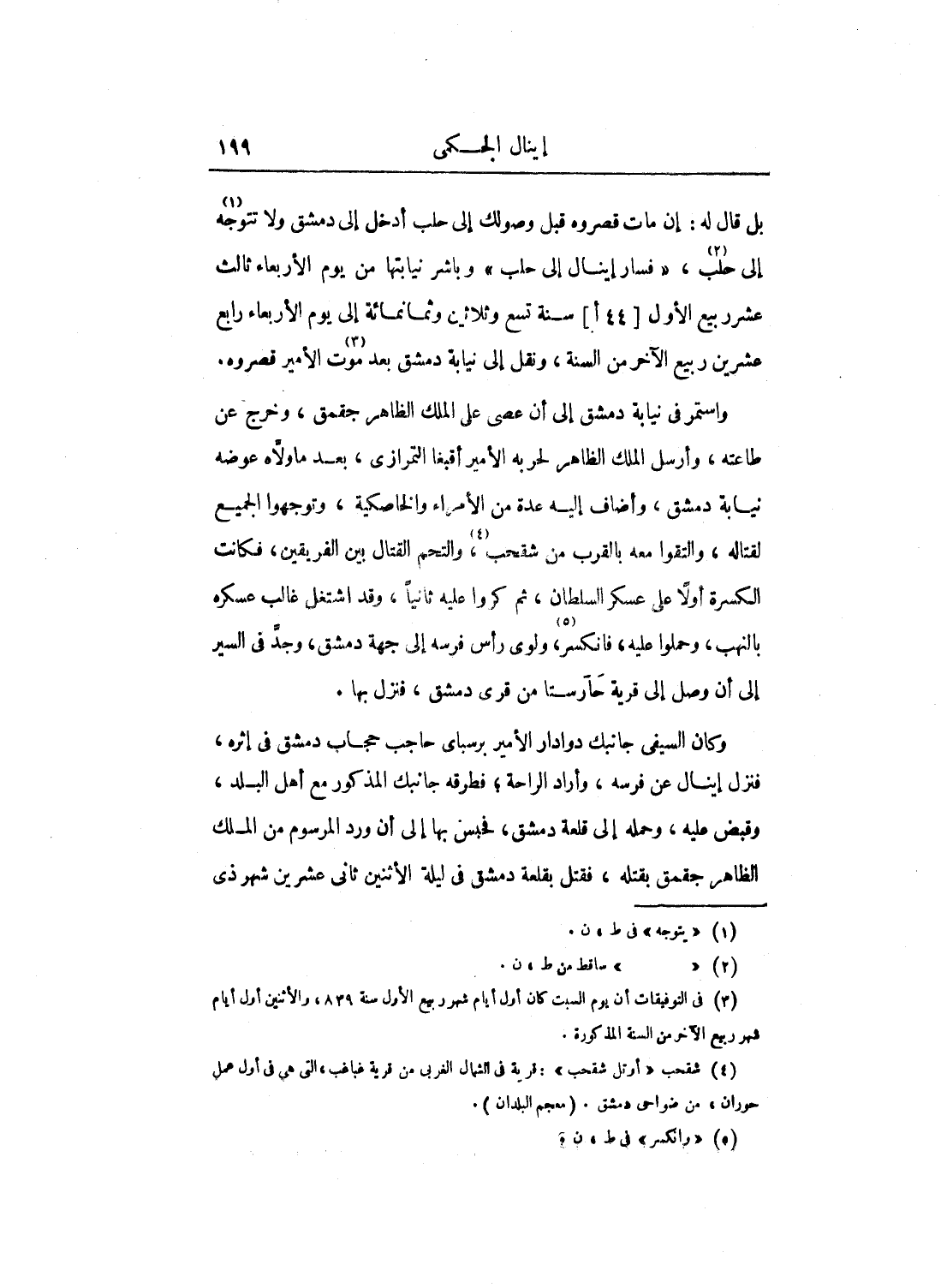 بل قال له: إن مات قصروه قبل وصولك إلى حلب أدخل إلى دمشق ولا تتوجه إلى حلب، فسار إينال إلى حلب. وباشر نيابتها من يوم الأربعاء ثالث عشر ربيع الأول سنة تسع وثلاثين وثمانمائة إلى يوم الأربعاء رابع عشرين ربيع الآخر من السنة، ونقل إلى نيابة دمشق بعد موت الأمير قصروه.
