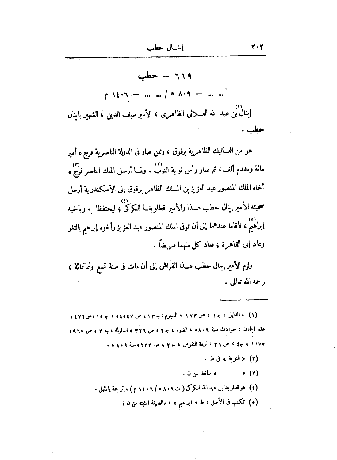 ولزم الأمير إينال حطب هذا الفراش إلى أن مات في سنة تسع وثمانمائة، رحمه الله تعالى.