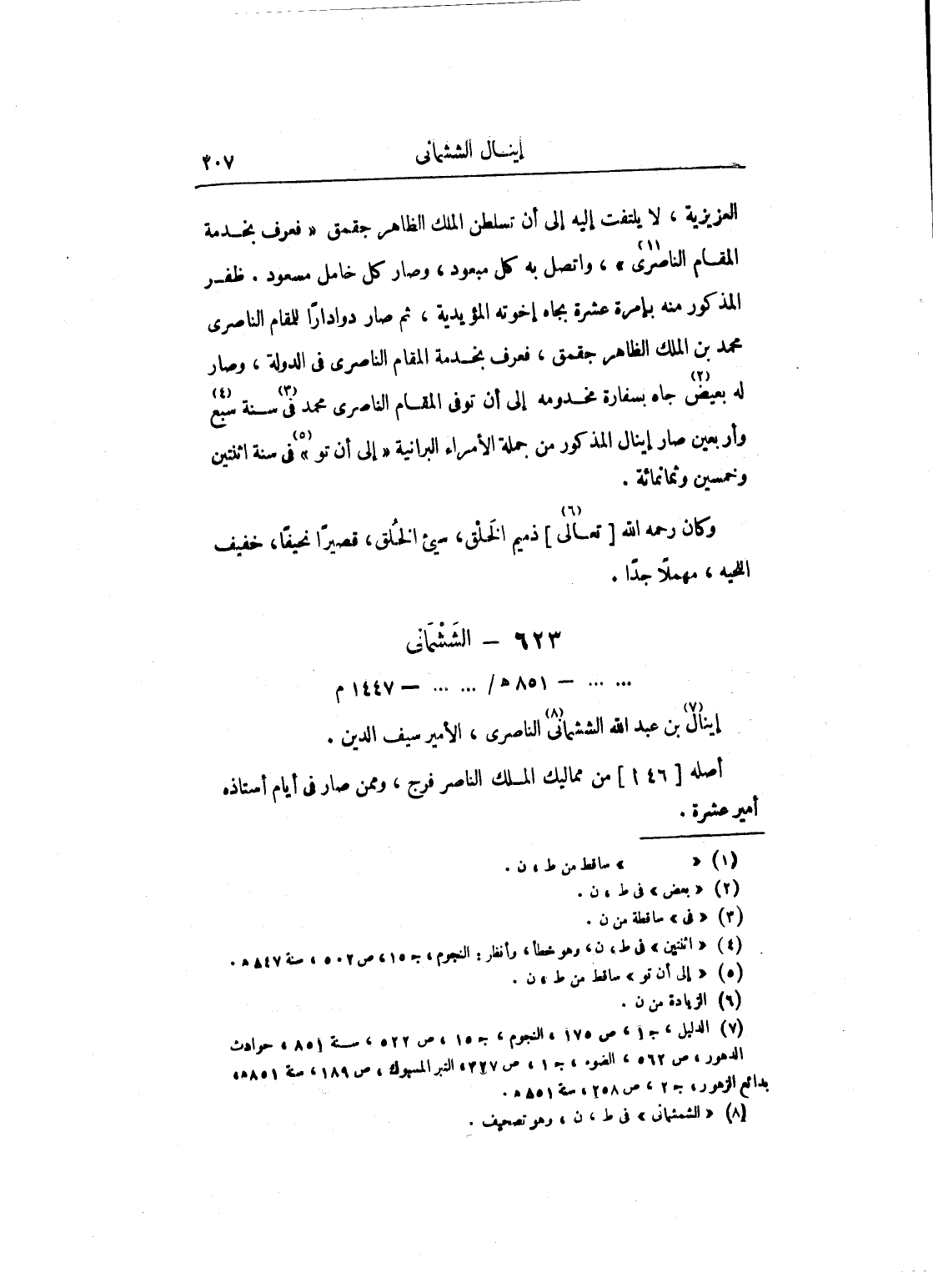 العزيزية، لا يلتفت إليه إلى أن تسلطن الملك الظاهر جقمق فعرف بخدمة المقام الناصري، واتصل به كل مبعود، وصار كل خامل مسعود. ظفر المذكور منه بإمرة عشرة بجاه إخوته المؤيدية، ثم صار دواداراً للمقام الناصري محمد بن الملك الظاهر جقمق، فعرف بخدمة المقام الناصري في الدولة، وصار له بعيض جاه بسفارة مخدومه إلى أن توفى المقام الناصري محمد في سنة سبع وأربعين صار إينال المذكور من جملة الأمراء البرانية إلى أن توفي في سنة اثنتين وخمسين وثمانمائة.