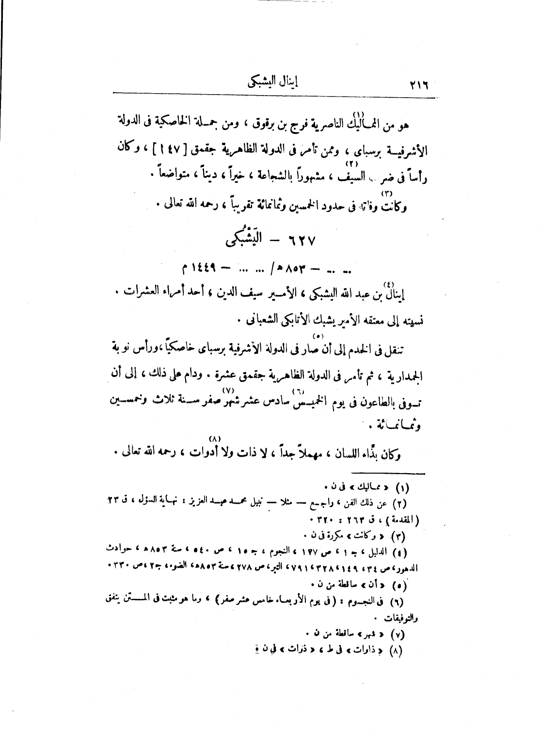 هو من المماليك الناصرية فرج بن برقوق، ومن جملة الخاصكية في الدولة الأشرفية برسباي، وممن تأمر في الدولة الظاهرية جقمق، وكان رأساً في شرب السيف، مشهوراً بالشجاعة، خيراً، ديناً، متواضعاً.