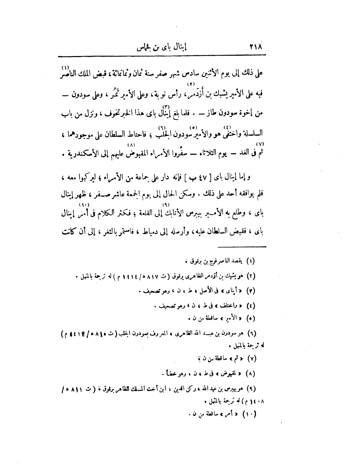 على ذلك إلى يوم الاثنين سادس شهر صفر سنة ثمان وثمانمائة، قبض الملك الناصر فيه على الأمير يشبك بن أزدمر، رأس نوبة، وعلى الأمير تمر، وعلى سودون - من إخوة سودون طاز -. فلما بلغ إينال باي هذا الخبر تخوف، ونزل من باب السلسلة واختفى هو والأمير سودون الجلب؛ فاحتاط السلطان على موجودهما، ثم في الغد - يوم الثلاثاء - سفروا الأمراء المقبوض عليهم إلى الإسكندرية.