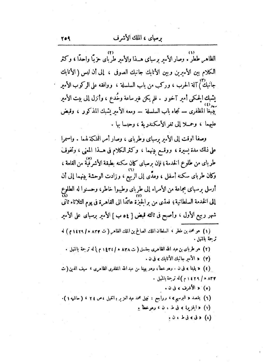 الظاهر ططر. وصار الأمير برسباي هذا والأمير طرباي حزباً واحداً، وكثر الكلام بين الأميرين وبين الأتابك جانبك الصوفي، إلى أن لبس الأتابك جانبك آلة الحرب، وركب من باب السلسلة، ووافقه على الركوب الأمير يشبك اجلكمي أمير آخور. فلم يكن غير ساعة وخدع، وأنزل إلى بيت الأمير بيبغا المظفري - تجاه باب السلسلة - ومعه الأمير يشبك المذكور، وقبض عليهما، وحملا إلى ثغر الإسكندرية، وحبسا بها.