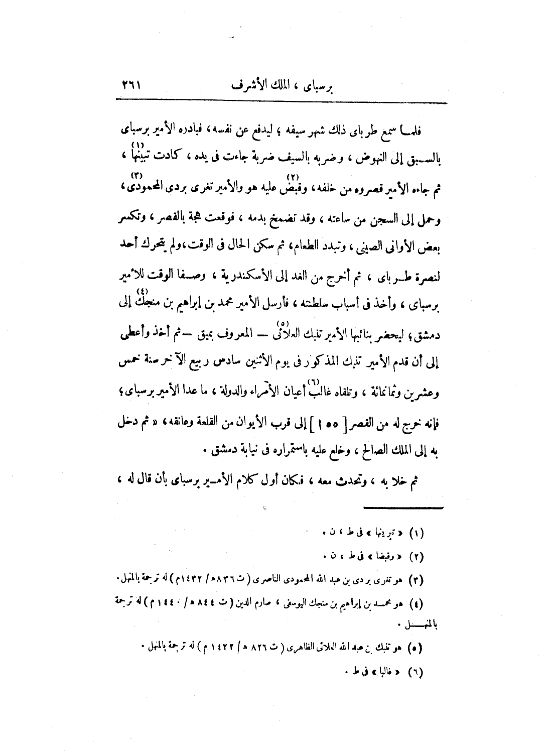 ثم خلا به، وتحدث معه، فكان أول كلام الأمير برسباي بأن قال له: