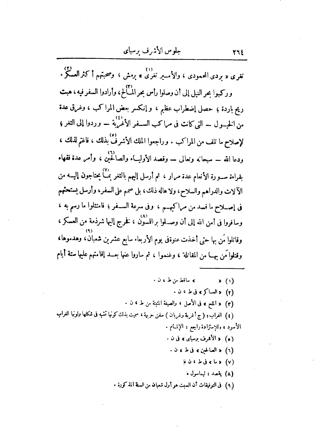 وركبوا بحر النيل إلى أن وصلوا رأس بحر المالح، وأرادوا السفر فيه، هبت ريح باردة؛ حصل اضطراب عظيم، وانكسر بعض المراكب، وغرق عدة من الخيول - التي كانت في مراكب السفر الأغربة - وردوا إلى الثغر؛ لإصلاح ما تلف من المراكب. وراجعوا الملك الأشرف بذلك، فاغتم لذلك، ودعا الله - سبحانه وتعالى - وقصد الأولياء والصالحين، وأمر عدة فقهاء بقراءة سورة الأنعام عدة مرار، ثم أرسل إليهم بالثغر بما يحتاجون إليه من الآلات والدراهم والسلاح، ولا هاله ذلك، بل صمم على السفر، وأرسل يستحثهم في إصلاح ما فسد من مراكبهم، وفي سرعة السفر؛ فامتثلوا ما رسم به، وسافروا في أمن الله إلى أن وصلوا بر اللمسون، فخرج إليها شرذمة من العسكر، وقاتلوا من بها حتى أخذت عنوة في يوم الأربعاء سابع عشرين شعبان، وهدموها، وقتلوا من بها من المقاتلة، وغنموا، ثم ساروا عنها بعد إقامتهم عليهم ستة أيام