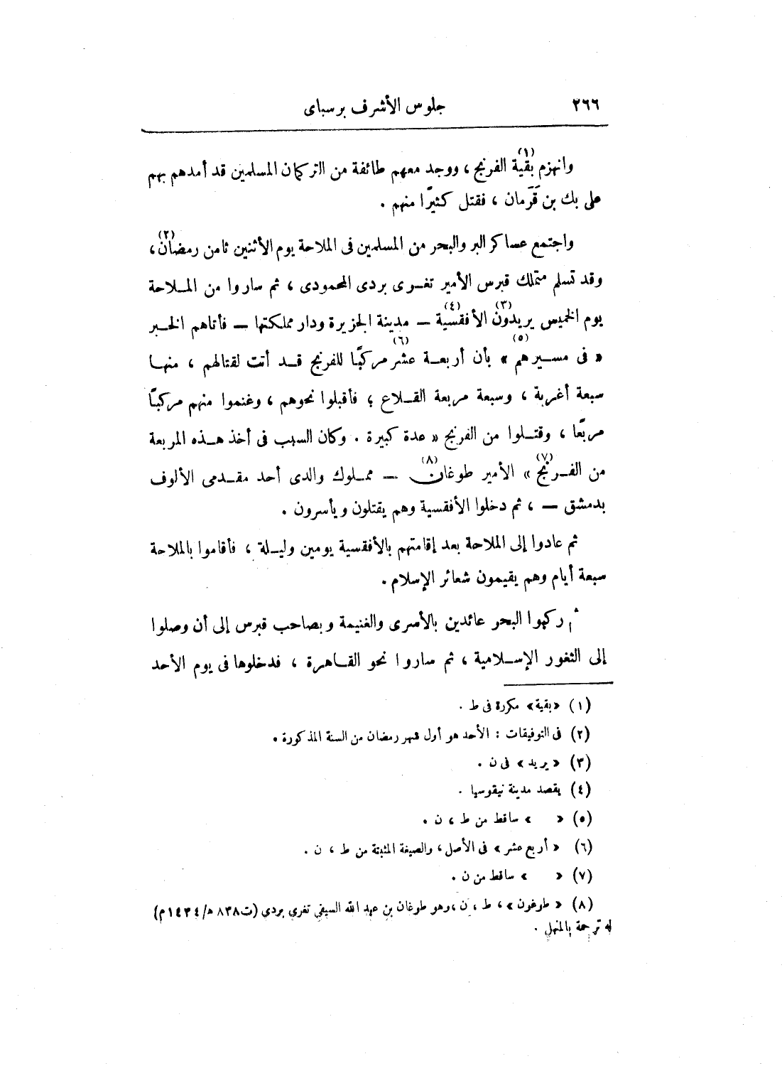 واجتمع عساكر البر والبحر من المسلمين في الملاحة يوم الاثنين ثامن رمضان، وقد تسلم متملك قبرس الأمير تغري بردى المحمودي، ثم ساروا من الملاحة يوم الخميس يريدون الأفقسية - مدينة الجزيرة ودار مملكتها - فأتاهم الخبر في مسيرهم بأن أربعة عشر مركباً للفرنج قد أتت لقتالهم، منها سبعة أغربة، وسبعة مربعة القلاع؛ فأقبلوا نحوهم، وغنموا منهم مركباً مربعاً، وقتلوا من الفرنج عدة كبيرة. وكان السبب في أخذ هذه المربعة من الفرنج الأمير طوغان - مملوك والدي أحد مقدمي الألوف بدمشق -، ثم دخلوا الأفقسية وهم يقتلون ويأسرون.