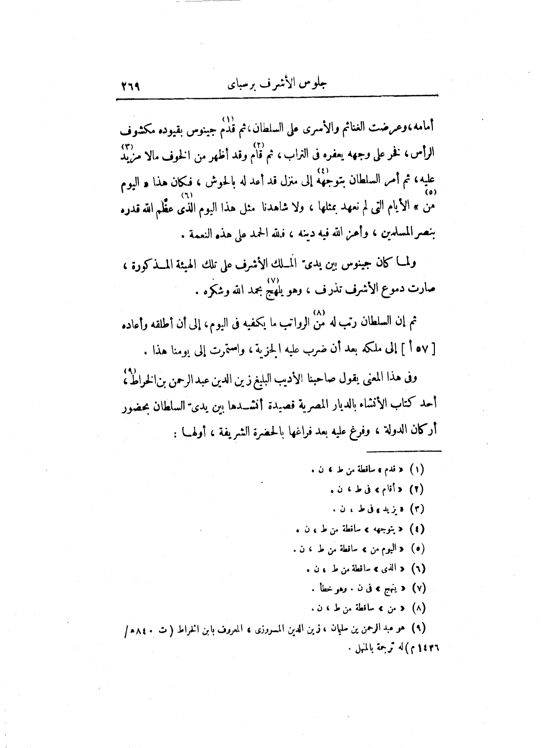 وفي هذا المعنى يقول صاحبنا الأديب البليغ زين الدين عبد الرحمن بن الخراط، أحد كتاب الإنشاء بالديار المصرية قصيدة أنشدها بين يدي السلطان بحضور أركان الدولة، وفرغ عليه بعد فراغها بالحضرة الشريفة، أولها: