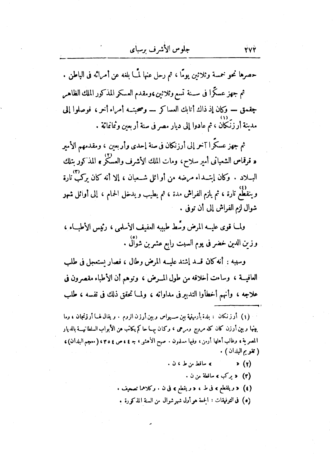 ثم جهز عسكراً آخر إلى أرزنكان في سنة إحدى وأربعين، ومقدمهم الأمير قرقماس الشعباني أمير سلاح، ومات الملك الأشرف والعسكر المذكور بتلك البلاد. وكان ابتداء مرضه من أوائل شعبان، إلا أنه كان يركب تارة وينقطع تارة، ثم يلزم الفراش مدة، ثم يطيب ويدخل الحمام، إلى أوائل شهر شوال لزم الفراش إلى أن توفى.