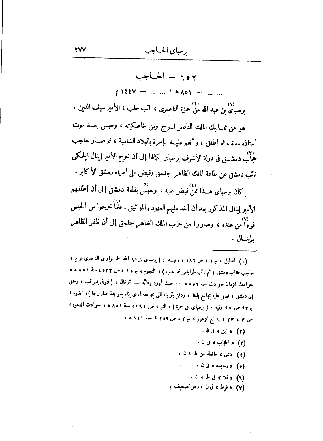 كان برسباي هذا ممن قبض عليه، وحبس بقلعة دمشق إلى أن أطلقهم الأمير إينال المذكور بعد أن أخذ عليهم العهود والمواثيق. فلما خرجوا من الحبس فروا من عنده، وصاروا من حزب الملك الظاهر جقمق إلى أن ظفر الظاهر بإينال.
