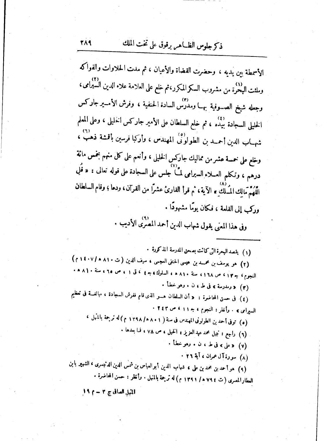 الأسمطة بين يديه، وحضرت القضاة والأعيان، ثم مدت الحلاوات والفواكه وملئت البحرة من مشروب السكر المكرر، ثم خلع على العلامة علاء الدين السيرامي، وجعله شيخ الصوفية بها ومدرس السادة الحنفية، وفرش الأمير جاركس الخليلي السجادة بيده، ثم خلع السلطان على الأمير جاركس الخليلي، وعلى المعلم شهاب الدين أحمد بن الطولوني المهندس، وأركبا فرسين بأقمشة ذهب، وخلع على خمسة عشر من مماليك جاركس الخليلي، وأنعم على كل منهم بخمس مائة درهم، وتكلم العلاء السيرامي لما جلس على السجادة على قوله تعالى: " قل اللهم مالك الملك " الآية، ثم قرأ القارئ عشراً من القرآن، ودعا؛ وقام السلطان وركب إلى القلعة، فكان يوماً مشهوداً.
