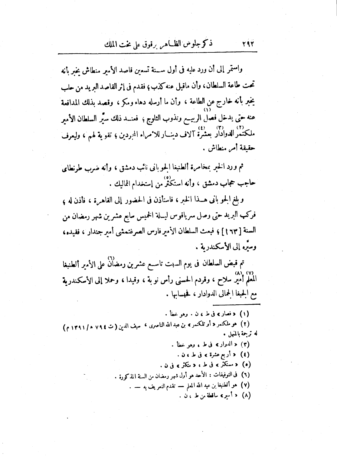 ثم ورد الخبر بمخامرة ألطنبغا الجوباني نائب دمشق، وأنه ضرب طرنطاي حاجب حجاب دمشق، وأنه استكثر من استخدام المماليك.