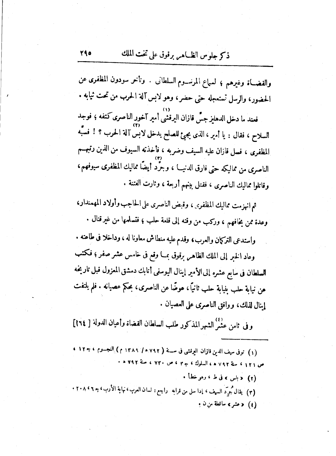 والقضاة وغيرهم؛ لسماع المرسوم السلطاني. وتأخر سودون المظفري عن الحضور، والرسل تستعجله حتى حضر، وهو لابس آلة الحرب من تحت ثيابه.