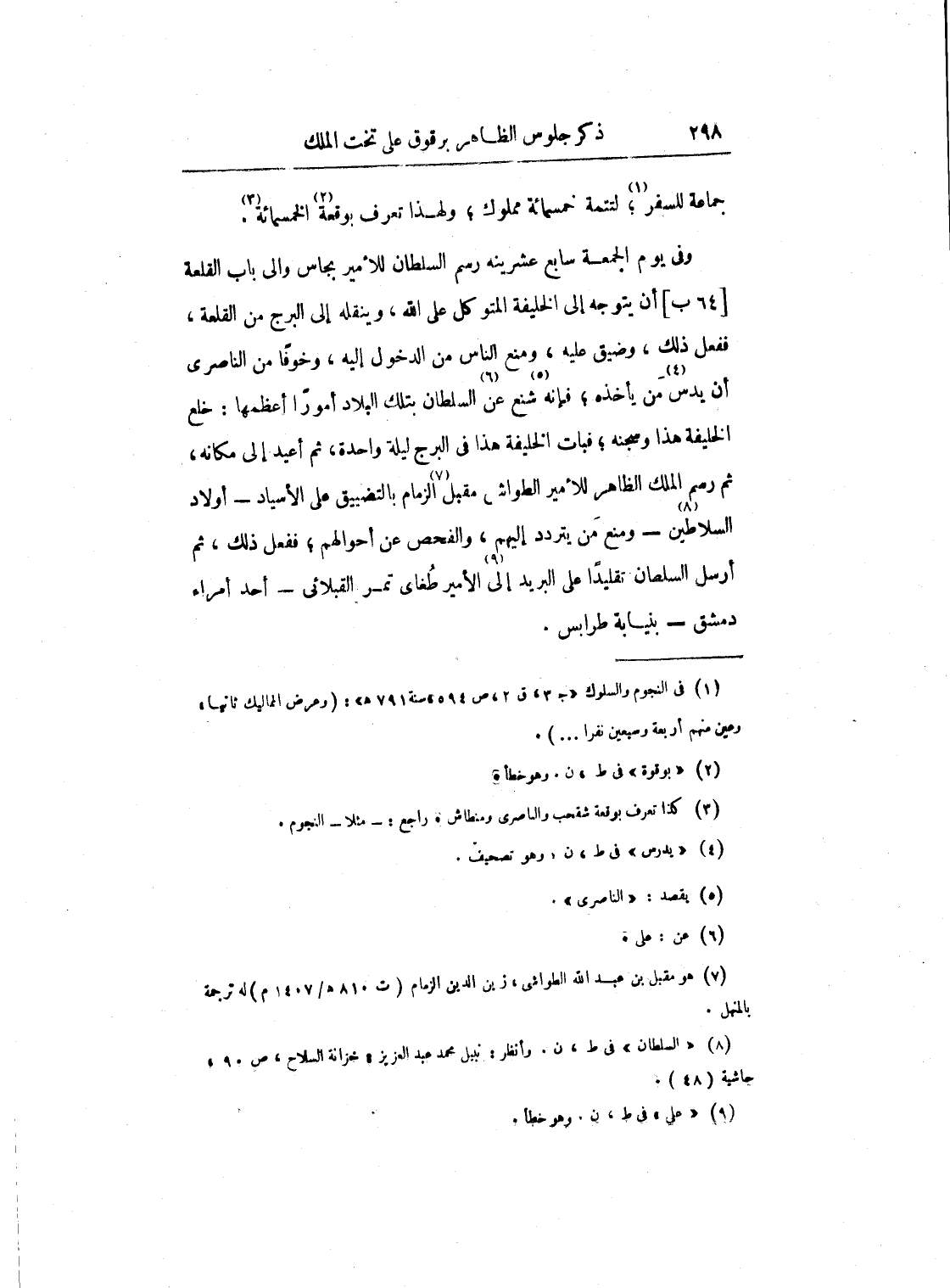 وفي يوم الجمعة سابع عشرينه رسم السلطان للأمير بجاس والي باب القلعة أن يتوجه إلى الخليفة المتوكل على الله، وينقله إلى البرج من القلعة، ففعل ذلك، وضيق عليه، ومنع الناس من الدخول إليه، وخوفاً من الناصري أن يدس من يأخذه؛ فإنه شنع عن السلطان بتلك البلاد أموراً أعظمها: خلع الخليفة هذا في البرج ليلة واحدة، ثم أعيد إلى مكانه، ثم رسم الملك الظاهر للأمير الطواشي مقبل الزمام بالتضييق على الأسياد - أولاد السلاطين - ومنع من يتردد إليهم، والفحص عن أحوالهم؛ ففعل ذلك، ثم أرسل السلطان تقليداً على البريد إلى الأمير طغاي تمر القبلائي - أحد أمراء دمشق - بنيابة طرابلس.