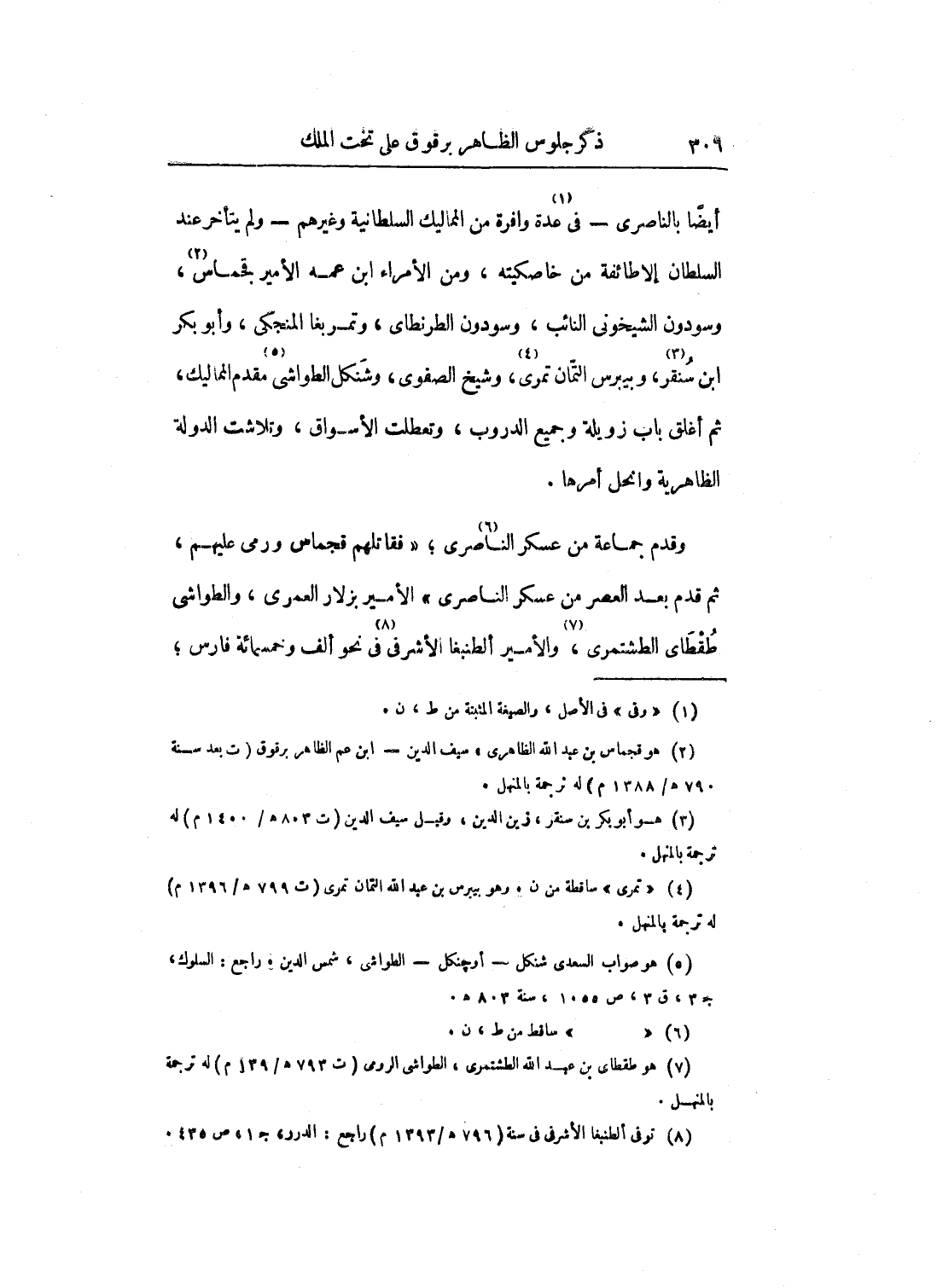 أيضاً بالناصري - في عدة وافرة من المماليك السلطانية وغيرهم - ولم يتأخر عند السلطان إلا طائفة من خاصكيته، ومن الأمراء ابن عمه الأمير قجماس، وسودون الشيخوني النائب، وسودون الطرنطاي، وتمربغا المنجكي، وأبو بكر ابن سنقر، وبيبرس التمان تمري، وشيخ الصفوي، وشنكل الطواشي مقدم المماليك، ثم أغلق باب زويلة وجميع الدروب، وتعطلت الأسواق، وتلاشت الدولة الظاهرية وانحل أمرها.