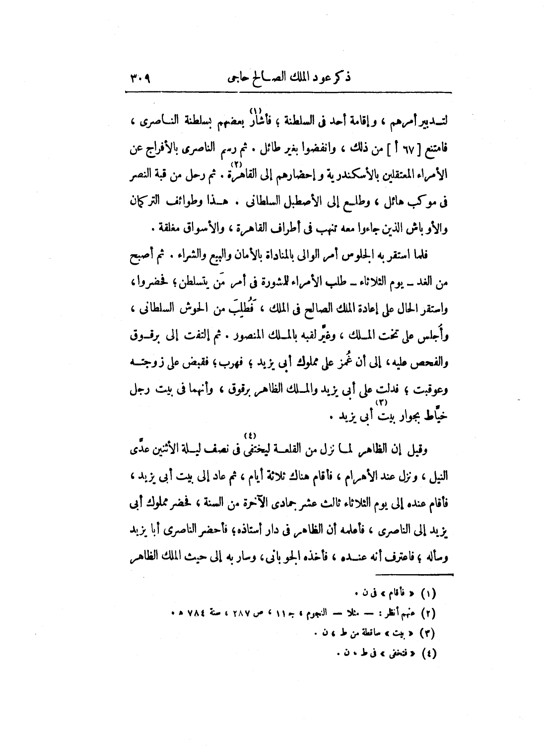 لتدبير أمرهم وإقامة أحد في السلطنة؛ فأشار بعضهم بسلطنة الناصري، فامتنع من ذلك، وانفضوا بغير طائل. ثم رسم الناصري بالإفراج عن الأمراء المعتقلين بالإسكندرية وإحضارهم إلى القاهرة. ثم رحل من قبة النصر في موكب هائل، وطلع إلى الإصطبل السلطاني. هذا وطوائف التركمان والأوباش الذي جاءوا معه تنهب في أطراف القاهرة، والأسواق مغلقة.