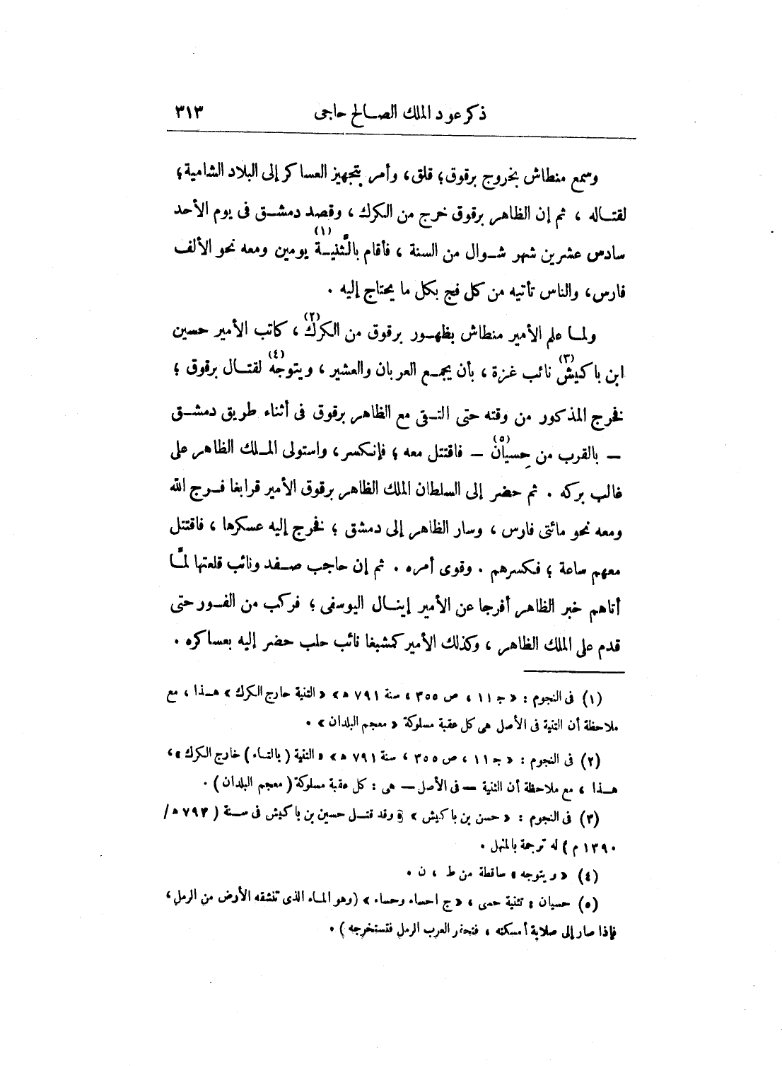 ولما علم الأمير منطاش بظهور برقوق من الكرك، كاتب الأمير حسين ابن باكيش نائب غزة، بأن يجمع العربان والعشير، ويتوجه لقتال برقوق؛ فخرج المذكور من وقته حتى التقى مع الظاهر برقوق في أثناء طريق دمشق - بالقرب من حسيان - فاقتتل معه؛ فانكسر، واستولى الملك الظاهر على غالب بركه. ثم حضر إلى السلطان الملك الظاهر برقوق الأمير قرابغا فرج الله ومعه نحو مائتي فارس، وسار الظاهر إلى دمشق؛ فخرج إليه عسكرها، فاقتتل معهم ساعة؛ فكسرهم. وقوى أمره. ثم إن حاجب صفد ونائبه قلعتها لما أتاهم خبر الظاهر أفرجا عن الأمير إينال اليوسفي؛ فركب من الفور حتى قدم على الملك الظاهر، وكذلك الأمير كمشبغا نائب حلب حضر إليه بعساكره.