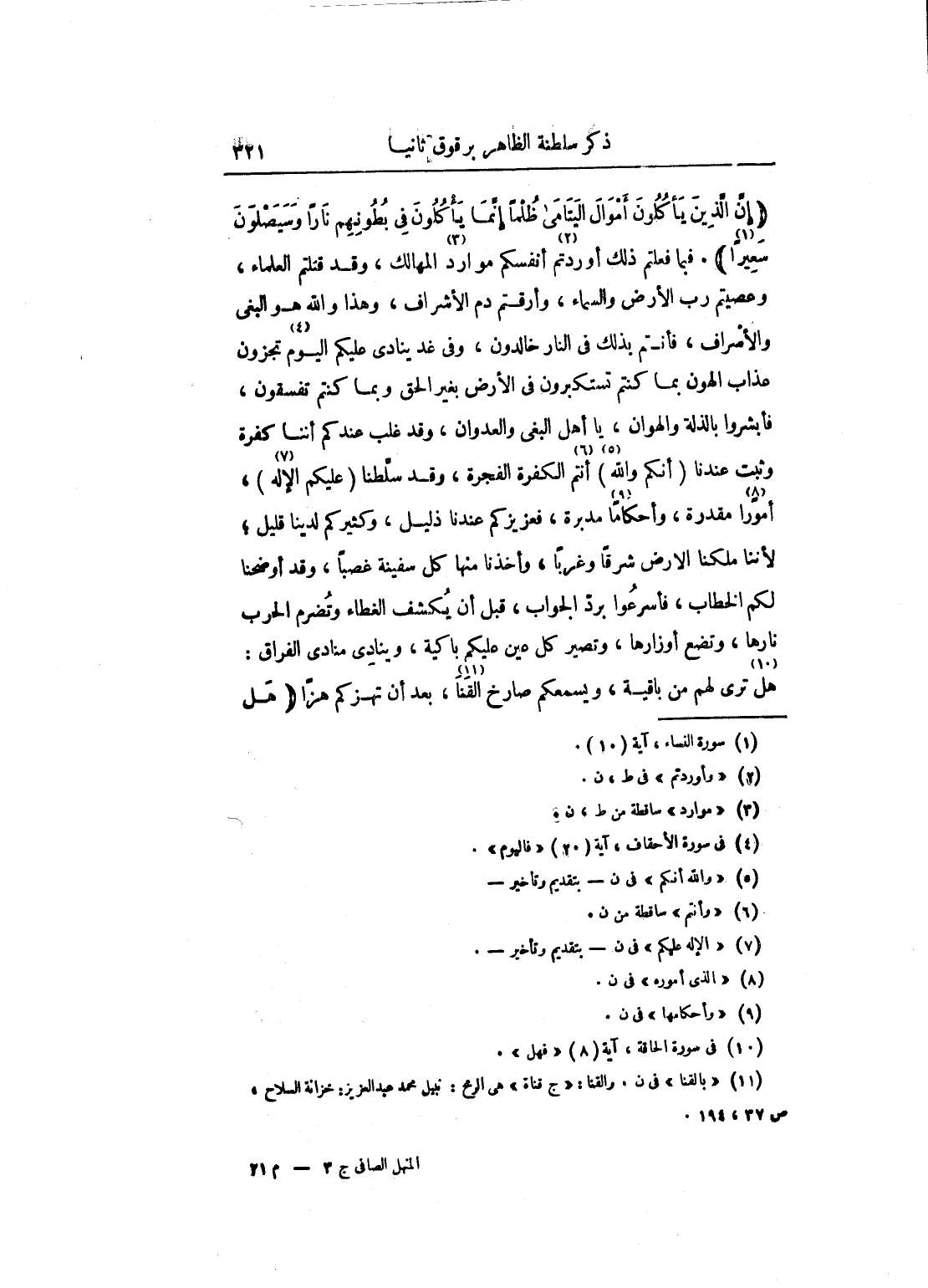 " إن الذين يأكلون أموال اليتامى ظلماً إنما يأكلون في بطونهم ناراً وسيصلون سعيراً ". فبما فعلتم ذلك أوردتم أنفسكم موارد المهالك، وقد قتلتم العلماء، وعصيتم رب الأرض والسماء، وأرقتم دم الأشراف، وهذا والله هو البغي والإسراف، فأنتم بذلك في النار خالدون، وفي غد ينادى عليكم اليوم يجزون عذاب الهون بما كنتم تستكبرون في الأرض بغير الحق وبما كنتم تفسقون، فأبشروا بالذلة والهوان، يا أهل البغي والعدوان، وقد غلب عندكم أننا كفرة وثبت عندنا أنكم والله أنتم الكفرة الفجرة، وقد سلطنا عليكم الإله، أموراً مقدرة، وأحكاماً مدبرة، فعزيزكم عندنا ذليل، وكثيركم لدينا قليل؛ لأننا ملكنا الأرض شرقاً وغرباً، وأخذنا منها كل سفينة غصباً، وقد أوضحنا لكم الخطاب، فأسرعوا برد الجواب، قبل أن يكشف الغطاء وتضرم الحرب نارها، وتضع أوزارها، وتصير كل عين عليكم باكية، وينادي منادي الفراق: هل ترى لهم من باقية، ويسمعكم صارخ القنا، بعد أن تهزكم هزاً " هل