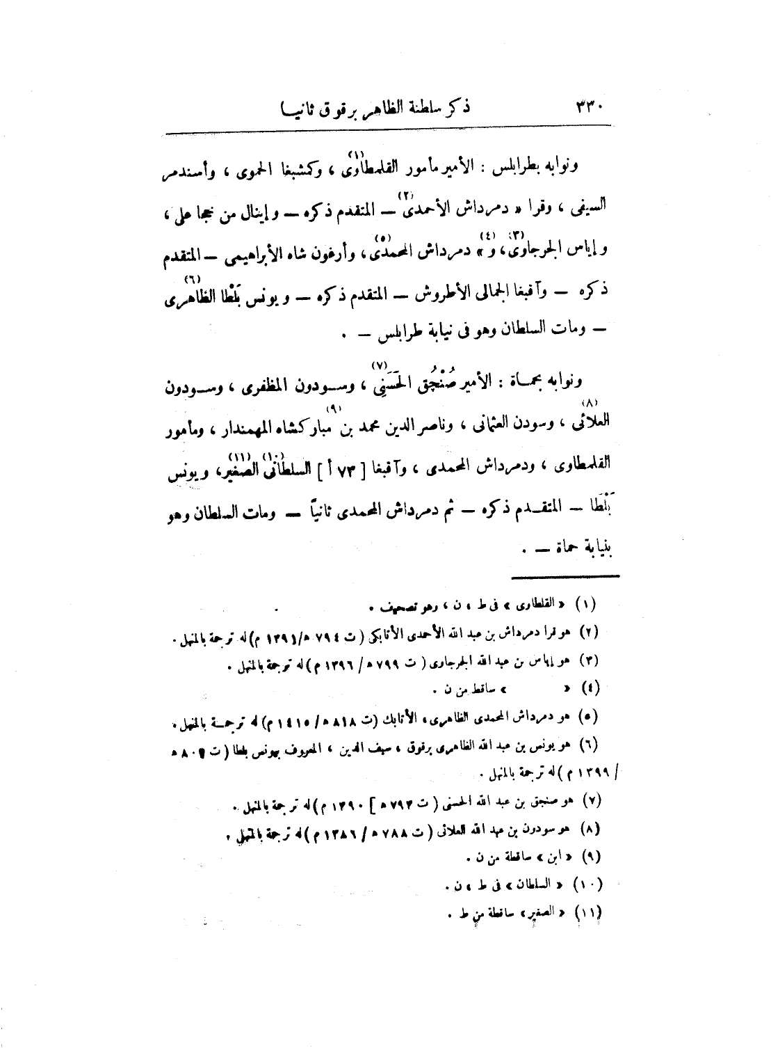 ونوابه بطرابلس: الأمير مأمور القلمطاوي، وكمشبغا الحموي، وأسندمر السيفي، وقرا دمرداش الأحمدي - المتقدم ذكره - وإينال من خجا على، وإياس الجرجاوي، ودمرداشى المحمدي، وأرغون شاه الإبراهيمي - المتقدم ذكره - وآقبغا الجمالي الأطروش - المتقدم ذكره - ويونس بلطا الظاهري - ومات السلطان وهو في نيابة طرابلس -.