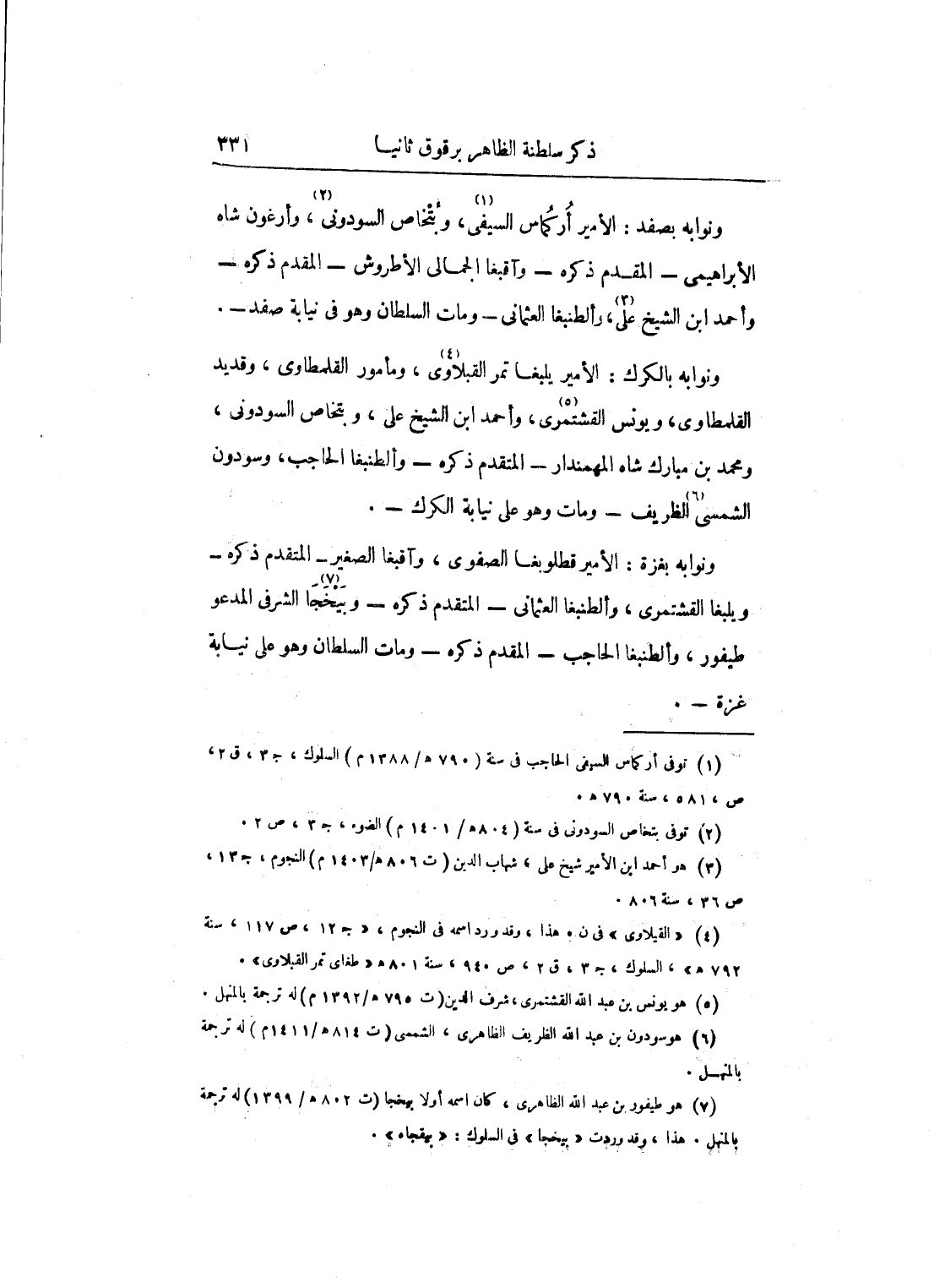 ونوابه بصفد: الأمير أركماس السيفي، وبتخاص السودوني، وأرغون شاه الإبراهيمي - المقدم ذكره - وآقبغا الجمالي الأطروش - المقدم ذكره - وأحمد ابن الشيخ علي، وألطنبغا العثماني - ومات السلطان وهو في نيابة صفد -.