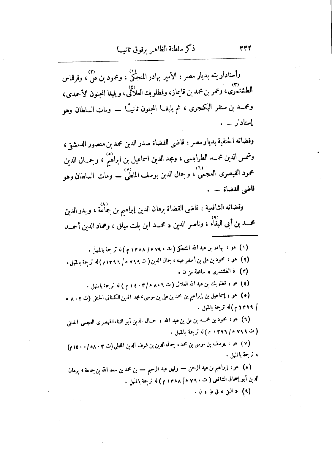 وقضاته بديار مصر: قاضي القضاة صدر الدين محمد بن منصور الدمشقي، وشمس الدين محمد الطرابلسي، ومجد الدين إسماعيل بن إبراهيم، وجمال الدين محمود القيصري العجمي، وجمال الدين يوسف الملطي - ومات السلطان وهو قاضي القضاة -.