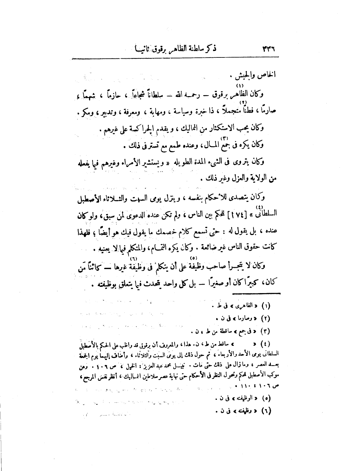 وكان الظاهر برقوق - رحمه الله - سلطاناً شجاعاً، حازماً، شهماً، صارماً، فطناً متجملاً، ذا خبرة وسياسة، ومهابة، ومعرفة، وتدبير، ومكر.
