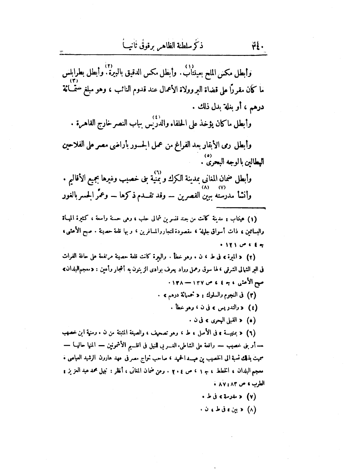 وأبطل مكس الملح بعينتاب. وأبطل مكس الدقيق بالبيرة. وأبطل بطرابلس ما كان مقرراً على قضاة البر وولاة الأعمال عند قدوم النائب، وهو مبلغ ستمائة درهم، أو بغلة بدل ذلك.