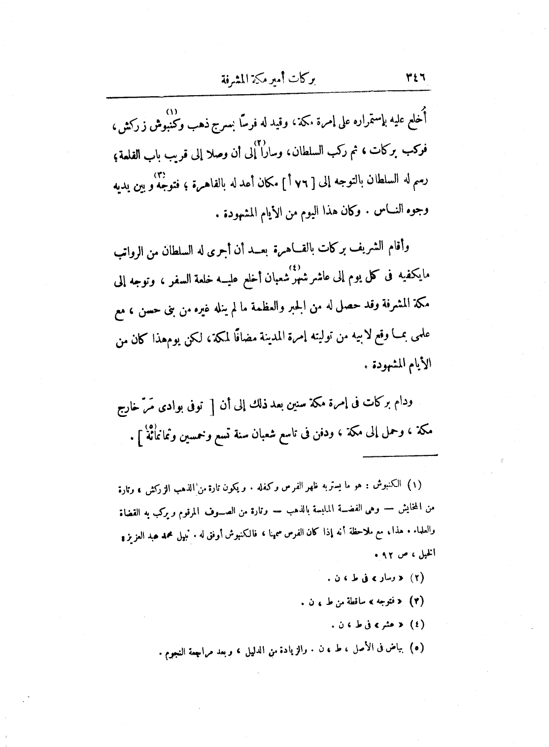 وأقام الشريف بركات بالقاهرة بعد أن أجرى له السلطان من الرواتب ما يكفيه في كل يوم إلى عاشر شهر شعبان أخلع عليه خلعة السفر، وتوجه إلى مكة المشرفة وقد حصل له من الجبر والعظمة ما لم ينله غيره من بني حسن، مع علمي بما وقع لأبيه من توليته إمرة المدينة مضافاً لمكة، لكن يوم هذا كان من الأيام المشهودة.