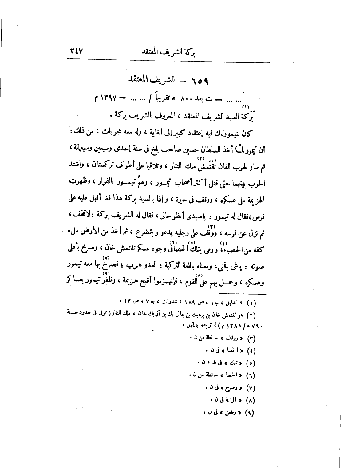 كان لتيمورلنك فيه اعتقاد كبير إلى الغاية، وله معه مجريات، من ذلك: أن تيمور لما أخذ السلطان حسين صاحب بلخ في سنة إحدى وسبعين وسبعمائة، ثم سار لحرب القان تقتمش ملك التتار، وتلاقيا على أطراف تركستان، واشتد الحرب بينهما حتى قتل أكثر أصحاب تيمور، وهم تيمور بالفرار، وظهرت الهزيمة على عسكره، ووقف في حيرة، وإذا بالسيد بركة هذا قد أقبل عليه على فرس، فقال له تيمور: يا سيدي انظر حالي، فقال له الشريف بركة: لا تخف، ثم نزل عن فرسه، ووقف على رجليه يدعو ويتضرع، ثم أخذ من الأرض ملء كفه من الحصباء، ورمى بتلك الحصا في وجوه عسكر تقتمش خان، وصرخ بأعلى صوته: ياغي قجتي، ومعناه باللغة التركية: العدو هرب؛ فصرخ بها معه تيمور وعسكره، وحمل بهم على القوم، فانهزموا أقبح هزيمة، وظفر تيمور بعساكر