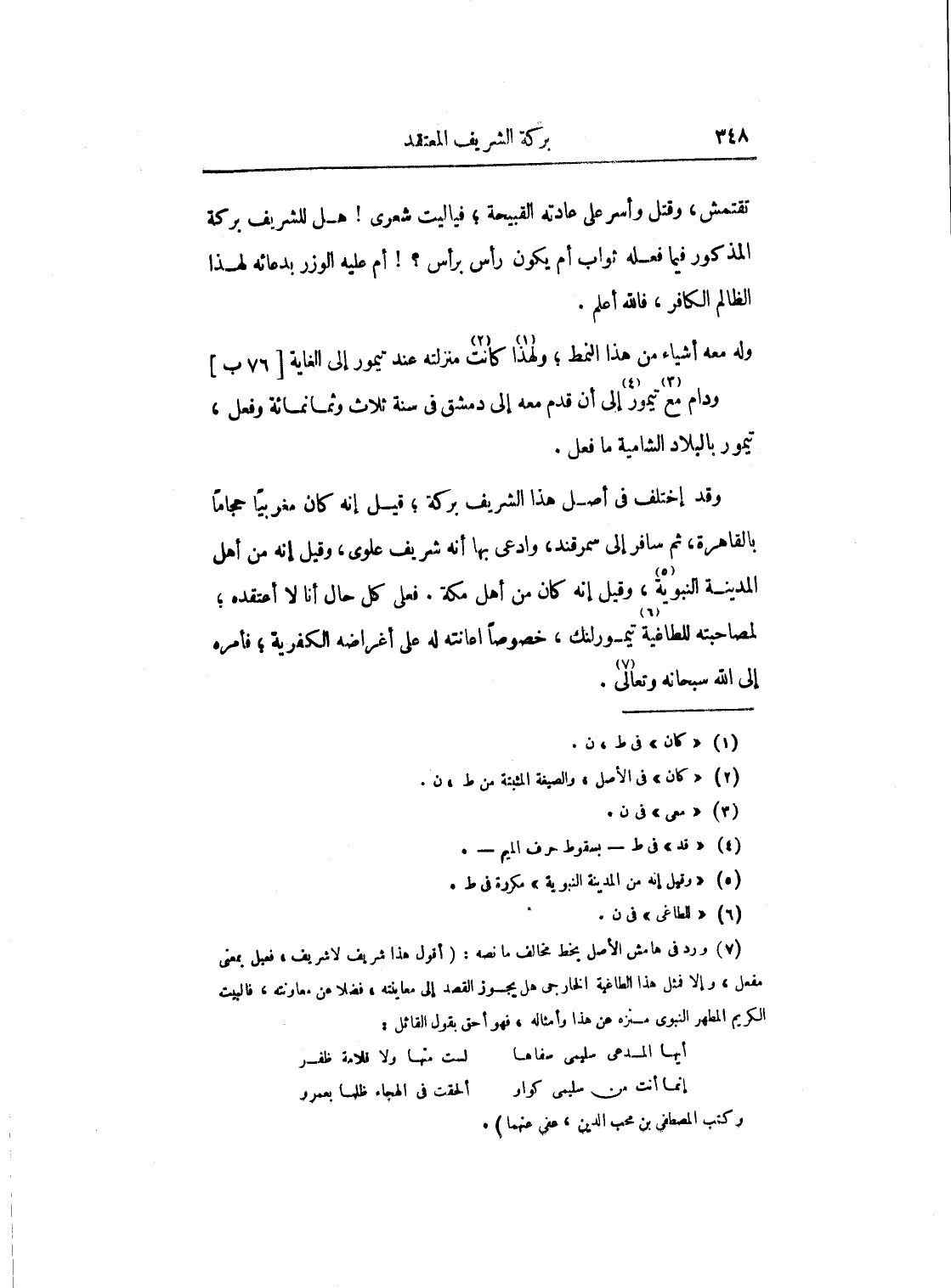 وقد اختلف في أصل هذا الشريف بركة؛ قيل إنه كان مغربياً حجاماً بالقاهرة، ثم سافر إلى سمرقند، وادعى بها أنه شريف علوي، وقيل إنه من أهل المدينة المنورة، وقيل إنه كان من أهل مكة. فعلى كل حال أنا لا أعتقده؛ لمصاحبته للطاغية تيمورلنك، خصوصاً إعانته له على أغراضه الكفرية؛ فأمره إلى الله سبحانه وتعالى.