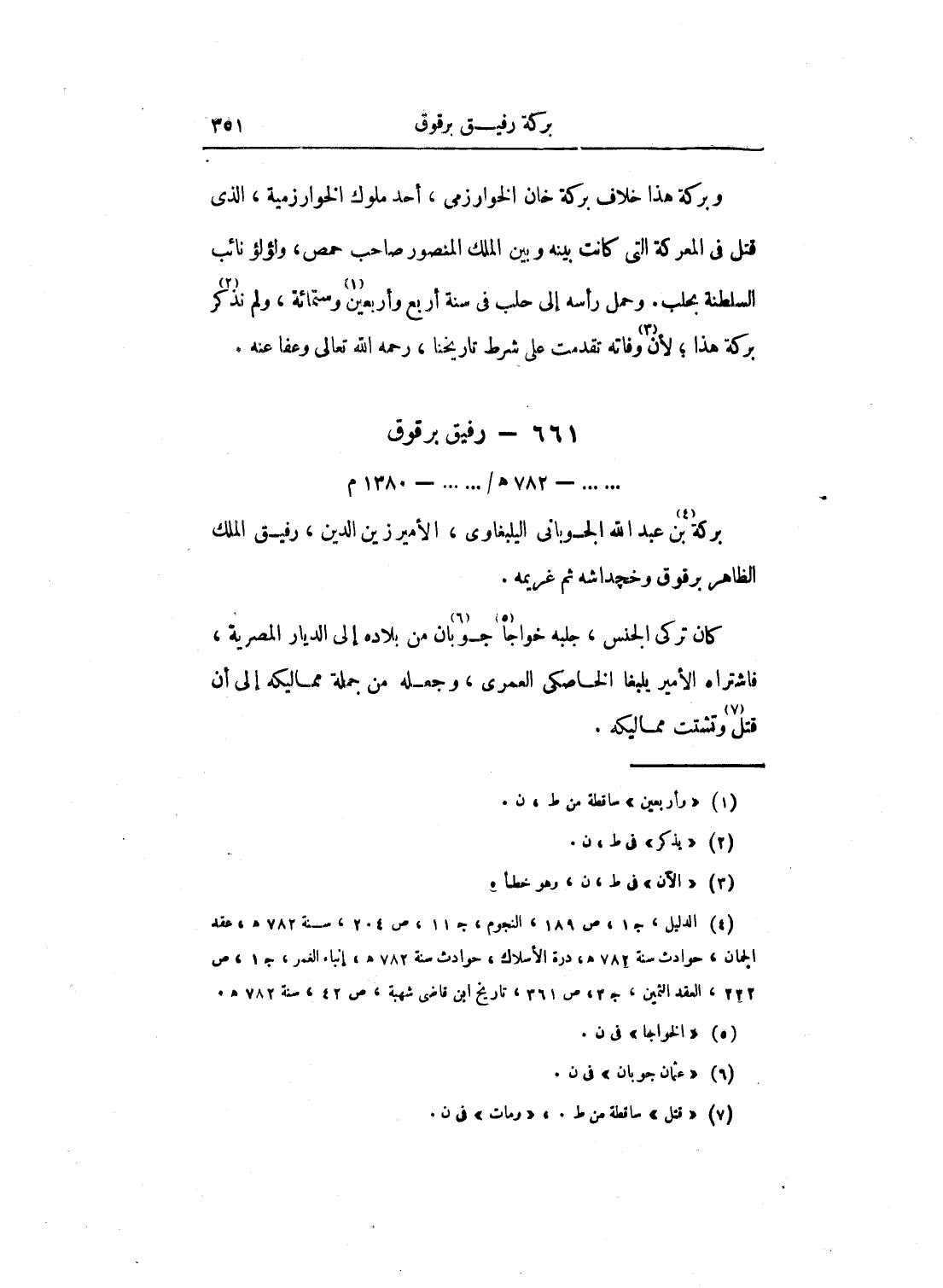 وبركة هذا خلاف بركة خان الخوارزمي، أحد ملوك الخوارزمية، الذي قتل في المعركة التي كانت بينه وبين الملك المنصور صاحب حمص، ولؤلؤ نائب السلطنة بحلب. وحمل رأسه إلى حلب في سنة أربع وأربعين وستمائة، ولم نذكر بركة هذا؛ لأن وفاته تقدمت على شرط تاريخنا، رحمه الله تعالى وعفا عنه.