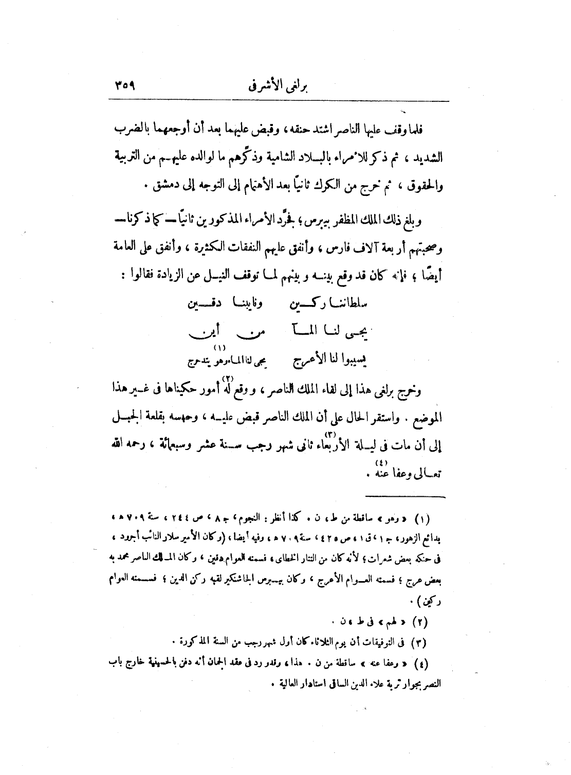 وخرج برلغي هذا إلى لقاء الملك الناصر، ووقع له أمور حكيناها في غير هذا الموضع. واستقر الحال على أن الملك الناصر قبض عليه، وحبسه بقلعة الجبل إلى أن مات في ليلة الأربعاء ثاني شهر رجب سنة عشر وسبعمائة، رحمه الله تعالى وعفا عنه.