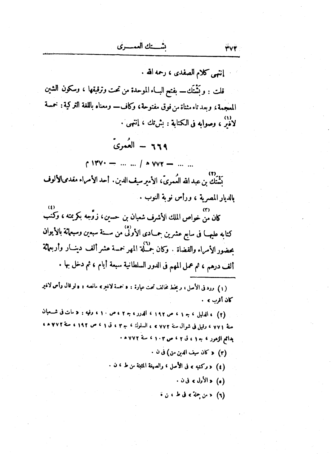 قلت: وبشتك - بفتح الباء الموحدة من تحت وترقيقها، وسكون الشين المعجمة، وبعد تاء مثناة من فوق مفتوحة، وكاف - ومعناه باللغة التركية: خمسة لا غير، وصوابه في الكتابة: بش تك، انتهى.