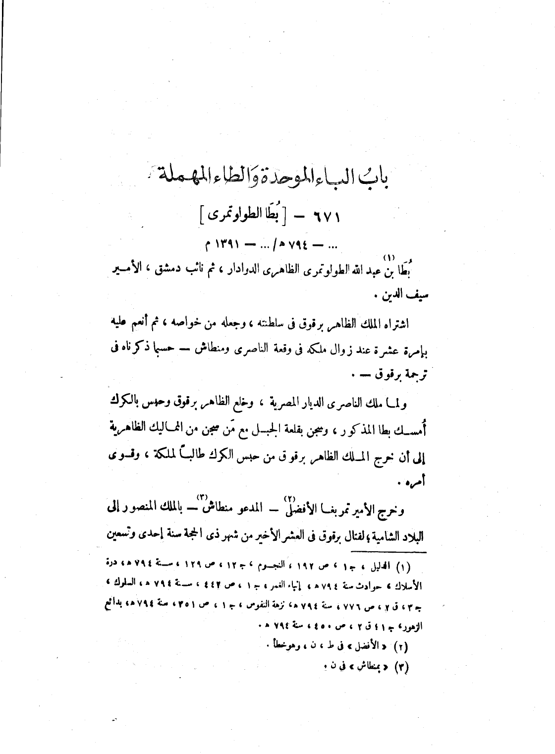 ولما ملك الناصري الديار المصرية، وخلع الظاهر برقوق وحبس بالكرك أمسك بطا المذكور، وسجن بقلعة الجبل مع من سجن من المماليك الظاهرية إلى أن خرج الملك الظاهر برقوق من حبس الكرك طالباً لملكه، وقوى أمره.