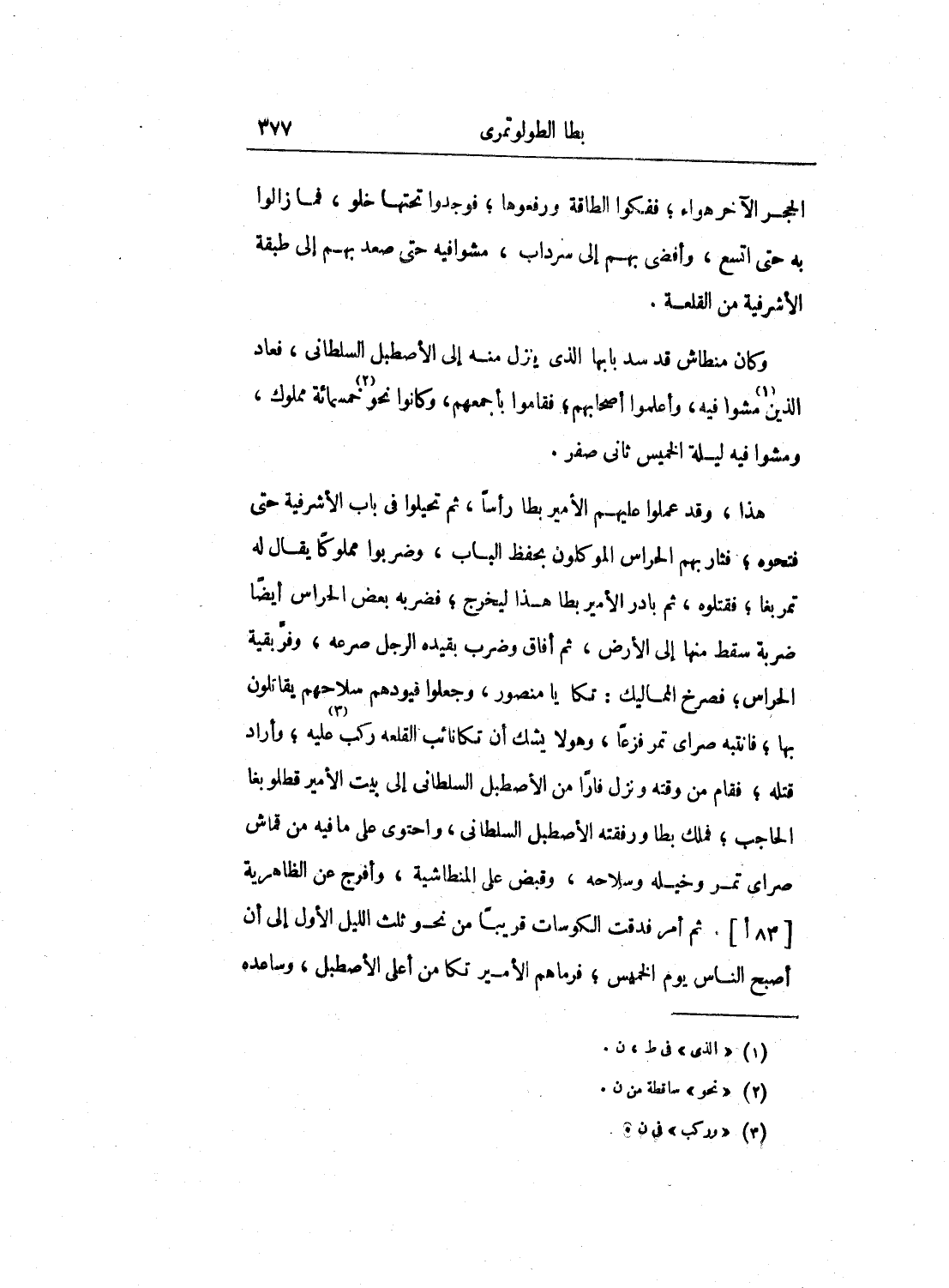 هذا، وقد عملوا عليهم الأمير بطا رأساً، ثم تحيلوا في باب الأشرفية حتى فتحوه؛ فثار بهم الحراس الموكلون بحفظ الباب، وضربوا مملوكاً يقال له تمربغا؛ فقتلوه، ثم بادر الأمير بطا هذا ليخرج؛ فضربه بعض الحراس أيضاً ضربة سقط منها إلى الأرض، ثم أفاق وضرب بقيده الرجل صرعه، وفر بقية الحراس؛ فصرخ المماليك: تكا يا منصور، وجعلوا قيودهم سلاحهم يقاتلون بها؛ فانتبه صراي تمر فزعاً، وهو لا يش أن تكا نائب القلعة ركب عليه؛ وأراد قتله؛ فقام من وقته ونزل فاراً من الإصطبل السلطاني إلى بيت الأمير قطلوبغا الحاجب؛ فملك بطا ورفقته الإصطبل السلطاني، واحتوى على ما فيه من قماش صراي تمر وخيله وسلاحه، وقبض على المنطاشية، وأفرج عن الظاهرية. ثم أمر فدقت الكوسات قريباً من نحو ثلث الليل الأول إلى أن أصبح الناس يوم الخميس؛ فرماهم الأمير تكا من أعلى الإصطبل، وساعده