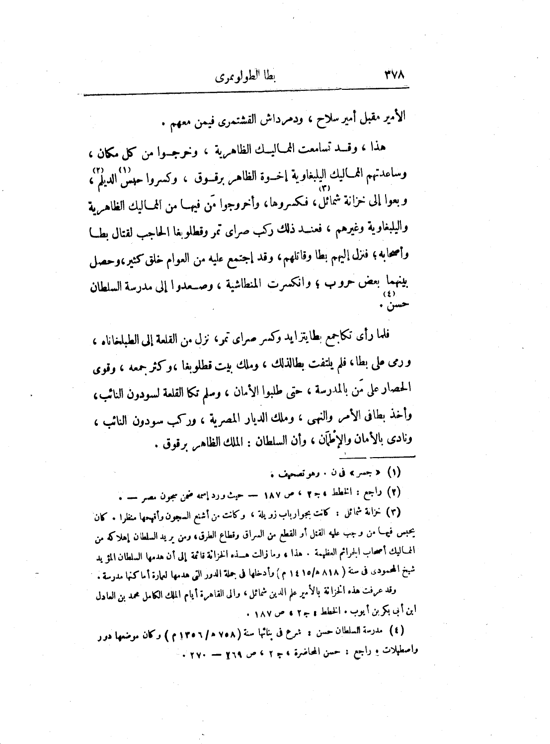 فلما رأى تكا جمع بطا يتزايد وكسر صراي تمر، نزل من القلعة إلى الطبلخاناه، ورمى على بطا، فلم يلتفت بطا لذلك، وملك بيت قطلوبغا، وكثر جمعه، وقوى الحصار على من بالمدرسة، حتى طلبوا الأمان، وسلم تكا القلعة لسودون النائب، وأخذ بطا في الأمر والنهي، وملك الديار المصرية، وركب سودون النائب، ونادى بالأمان والإطمآن، وأن السلطان: الملك الظاهر برقوق.
