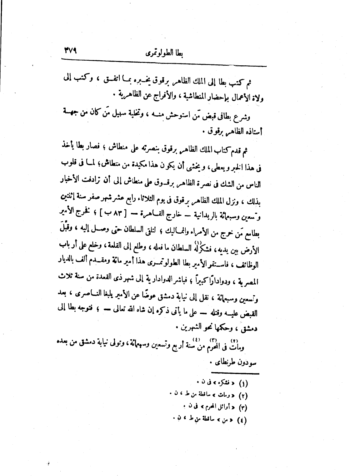 وشرع بطا في قبض من استوحش منه، وتخلية سبيل من كان من جهة أستاذه الظاهر برقوق.