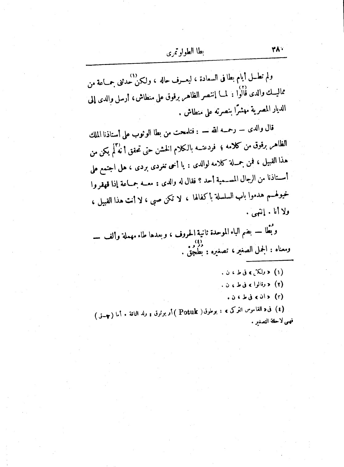 وبطا - بضم الباء الموحدة ثانية الحروف، وبعدها طاء مهملة وألف - ومعناه: الجمل الصغير، تصغيره: بطجق.