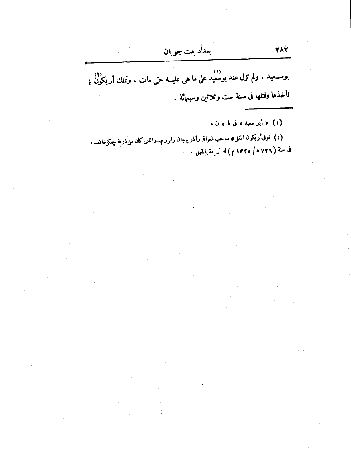 بوسعيد. ولم تزل عند بوسعيد على ما هي عليه حتى مات. وتملك أربكون؛ فأخذها وقتلها في سنة ست وثلاثين وسبعمائة.