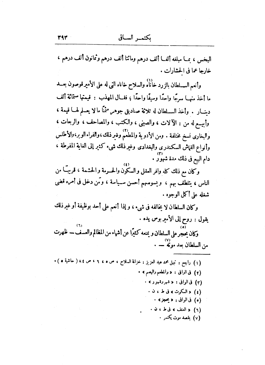 وأنعم السلطان بالزرد خاناه والسلاح خاناه التي له على الأمير قوصون بعد ما أخذ منها سرجاً واحداً وسيفاً واحداً؛ فقال المهذب: قيمتها ستمائة ألف دينار. وأخذ السلطان له ثلاثة صناديق جوهر مثمناً ما لا يعلم لها قيمة، وأبيع له من: الآلات، والصيني، والكتب، والمصاحف، والربعات، والبخاري نسخ مختلفة. ومن الأدوية والمطعم وغير ذلك، والفراء الوبر، والأطلس وأنواع القماش السكندري والبغدادي وغير ذلك شيء كثير إلى الغاية المفرطة، دام البيع في ذلك مدة شهور.