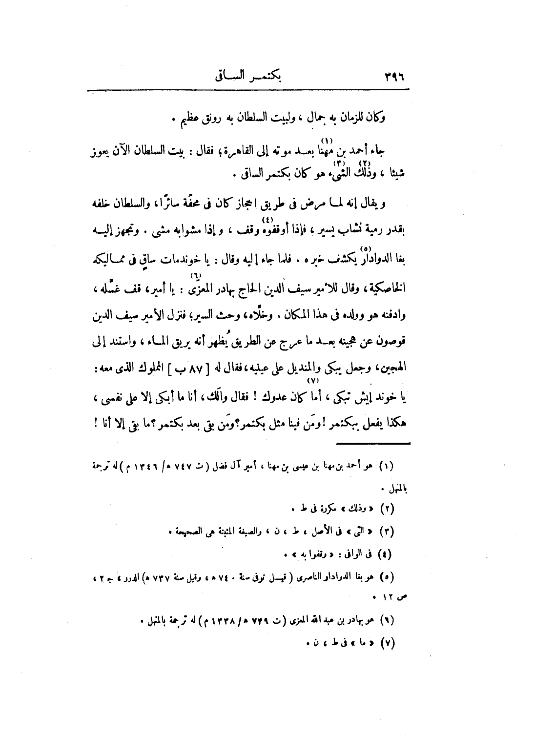 جاء أحمد بن مهنا بعد موته إلى القاهرة؛ فقال: بيت السلطان الآن يعوز شيئاً، وذلك الشيء هو كان بكتمر الساقي.