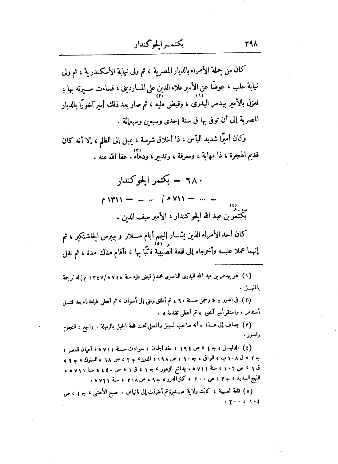 كان من جملة الأمراء بالديار المصرية، ثم ولى نيابة الإسكندرية، ثم ولى نيابة حلب، عوضاً عن الأمير علاء الدين على المارديني، فساءت سيرته بها؛ فعزل بالأمير بيدمر البدري، وقبض عليه، ثم صار بعد ذلك أمير آخوراً بالديار المصرية إلى أن توفى بها في سنة إحدى وسبعين وسبعمائة.