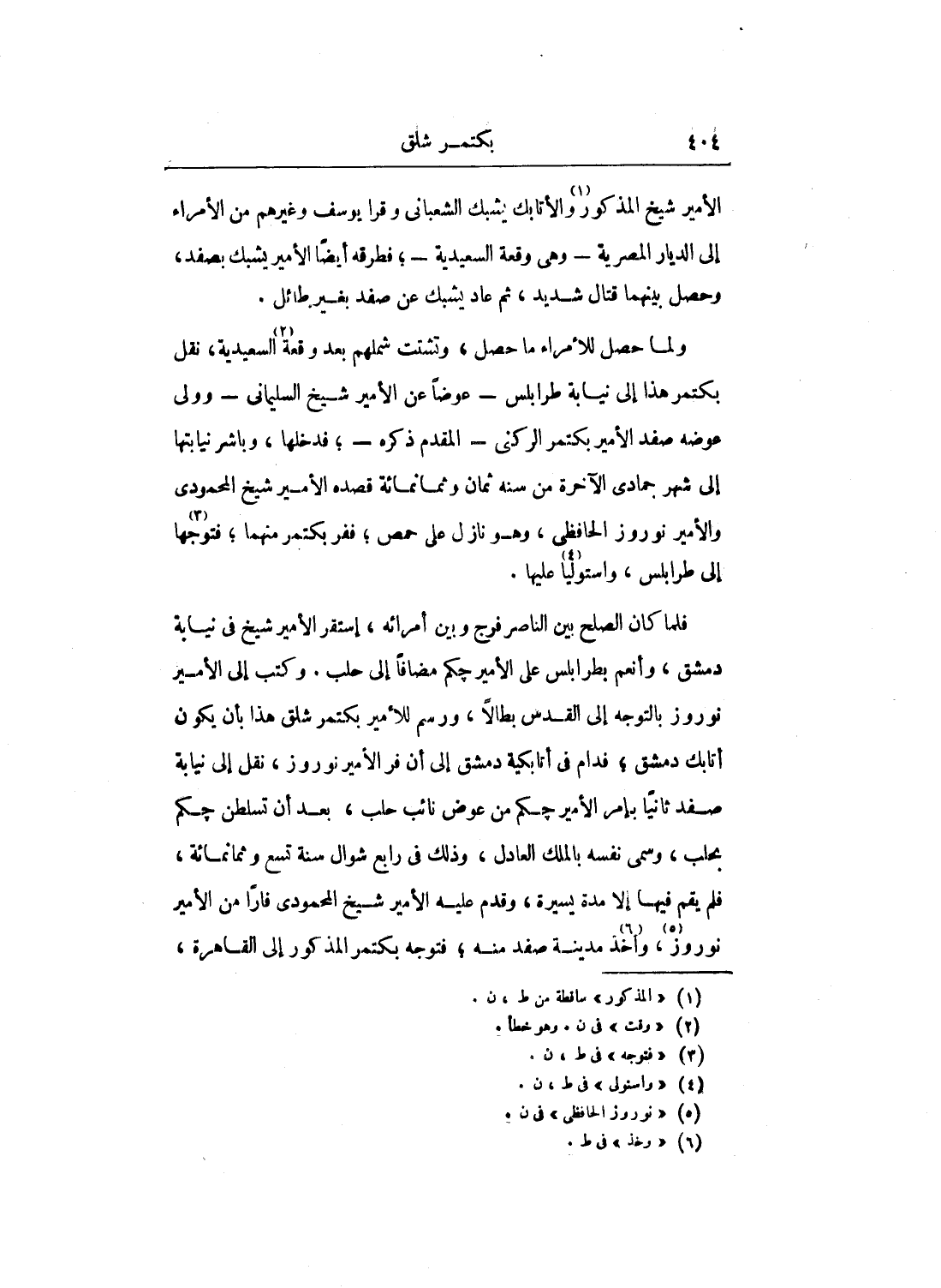 فلما كان الصلح بين الناصر فرج وبين أمرائه، استقر الأمير شيخ في نيابة دمشق، وأنعم بطرابلس على الأمير جكم مضافاً إلى حلب. وكتب إلى الأمير نوروز بالتوجه إلى القدس بطالاً، ورسم للأمير بكتمر شلق هذا بأن يكون أتابك دمشق؛ فدام في أتابكية دمشق إلى أن فر الأمير نوروز، نقل إلى نيابة صفد ثانياً بأمر الأمير جكم من عوض نائب حلب، بعد أن تسلطن جكم بحلب، وسمى نفسه بالملك العادل، وذلك في رابع شوال سنة تسع وثمانمائة، فلم يقم فيها إلا مدة يسيرة، وقدم عليه الأمير شيخ المحمودي فاراً من الأمير نوروز، وأخذ مدينة صفد منه؛ فتوجه بكتمر المذكور إلى القاهرة،
