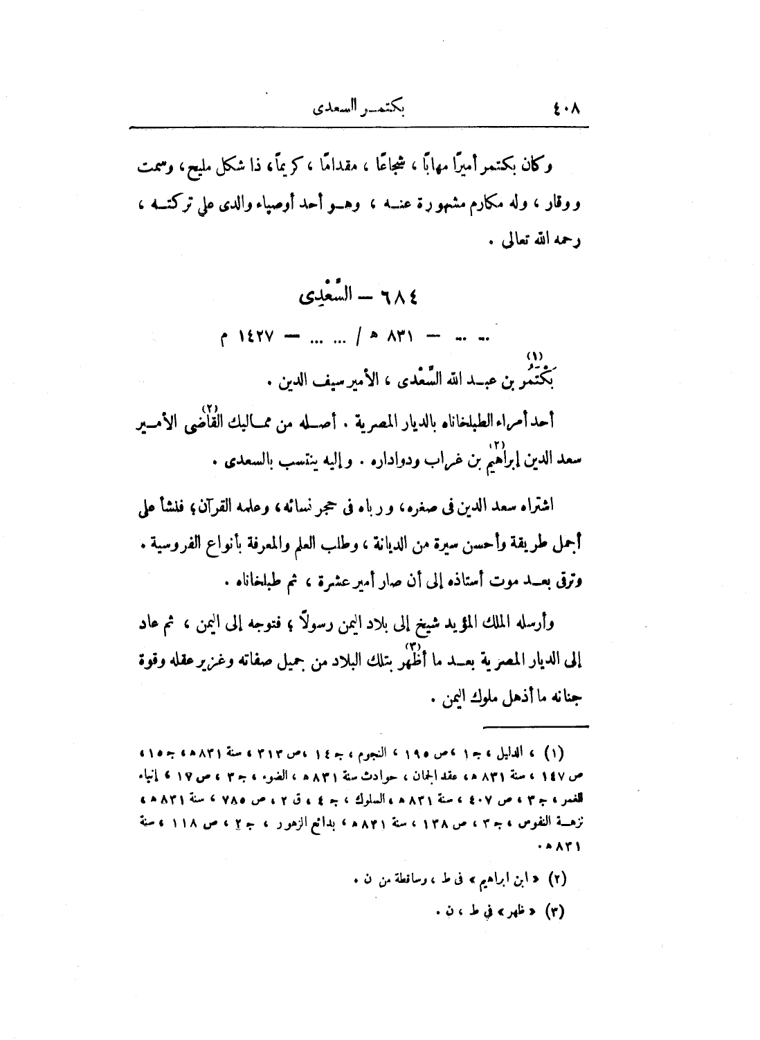 أحد أمراء الطبلخاناه بالديار المصرية. أصله من مماليك القاضي الأمير سعد الدين إبراهيم بن غراب ودواداره. وإليه ينتسب بالسعدي.