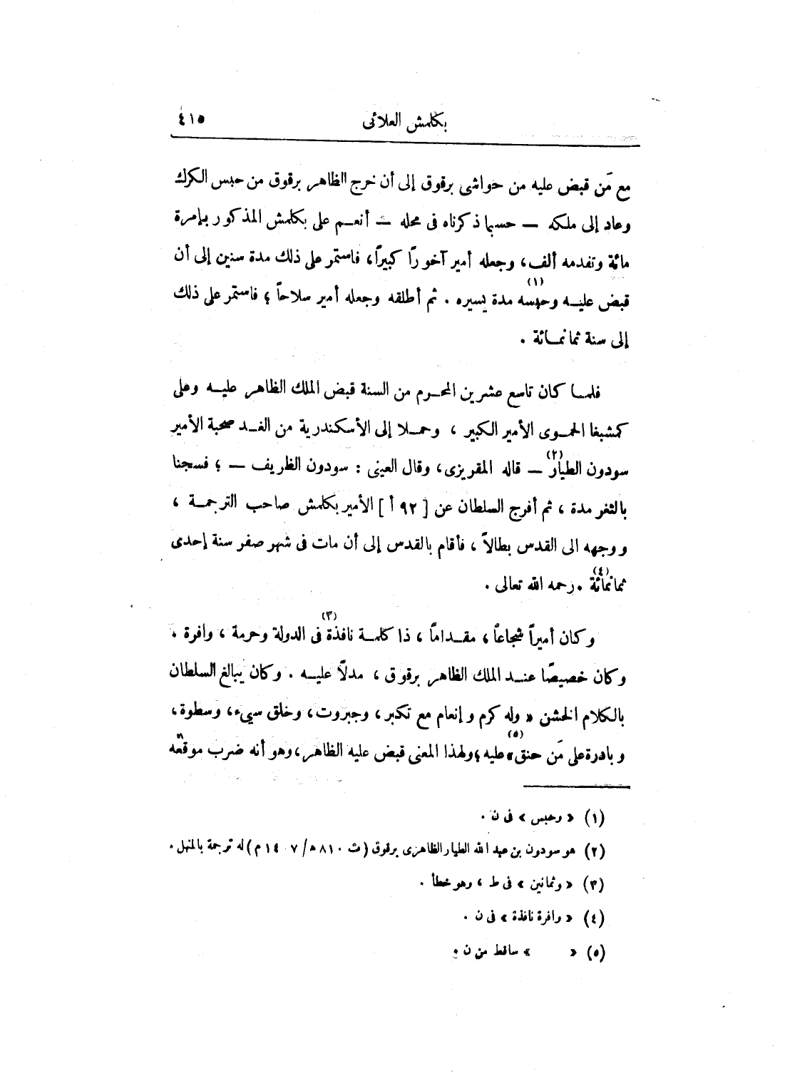 مع من قبض عليه من حواشي برقوق إلى أن خرج الظاهر برقوق من حبس الكرك وعاد إلى ملكه - حسبما ذكرناه في محله - أنعم على بكلمش المذكور بإمرة مائة وتقدمة ألف، وجعله أمير آخوراً كبيراً، فاستمر على ذلك مدة سنين إلى أن قبض عليه وحبسه مدة يسيرة. ثم أطلقه وجعله أمير سلاحاً؛ فاستمر على ذلك إلى سنة ثمانمائة.
