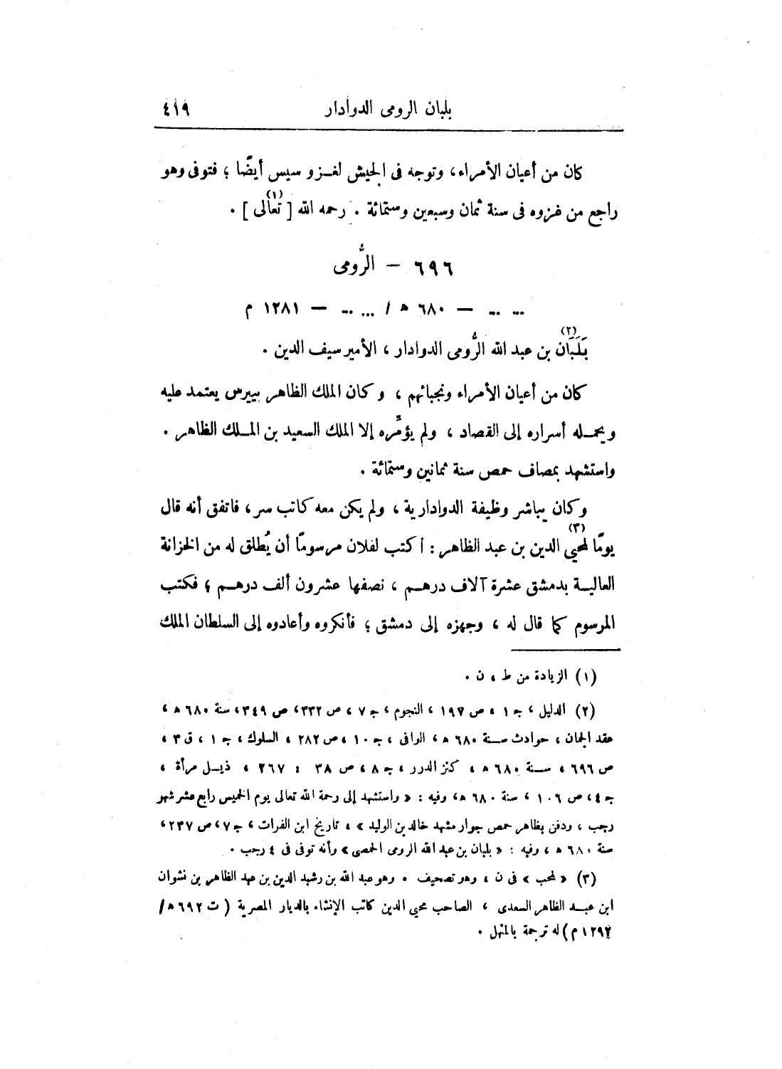 كان من أعيان الأمراء، وتوجه في الجيش لغزو سيس أيضاً؛ فتوفى وهو راجع من غزوه في سنة ثمان وسبعين وستمائة. رحمه الله تعالى.