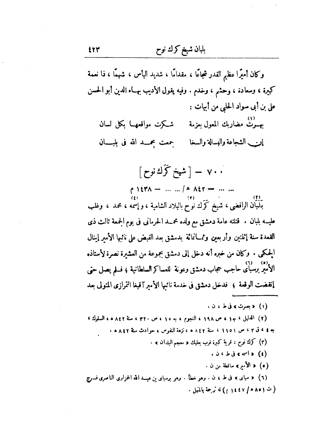 بلبان الرافضي، شيخ كرك نوح بالبلاد الشامية، واسمه، محمد، وغلب عليه بلبان. قتلته عامة دمشق مع ولده محمد الحرماني في يوم الجمعة ثالث ذي القعدة سنة اثنتين وأربعين وثمانمائة بدمشق بعد القبض على نائبها الأمير إينال اجلكمي. وكان من خبره أنه دخل إلى دمشق بمجموعة من العشيرة نصرة لأستاذه الأمير برسباي حاجب حجاب دمشق وعونة للعساكر السلطانية؛ فلم يصل حتى انقضت الوقعة؛ فدخل دمشق في خدمة نائبها الأمير آقبغا التمرازي المتولي بعد