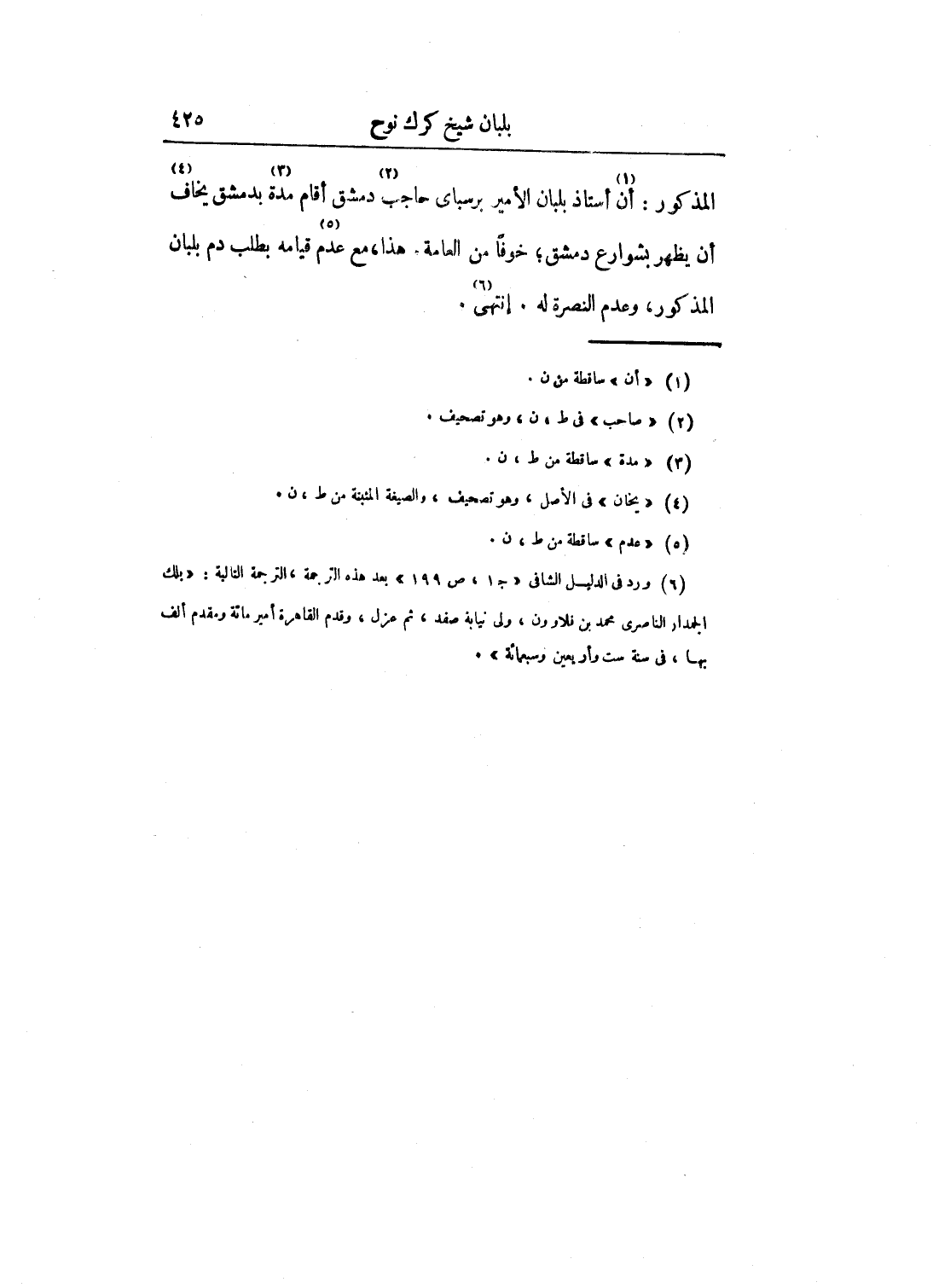 المذكور: أن أستاذ بلبان الأمير برسباي حاجب دمشق أقام مدة بدمشق يخاف أن يظهر بشوارع دمشق؛ خوفاً من العامة. هذا، مع عدم قيامه بطلب دم بلبان المذكور، وعدم النصرة له. انتهى.