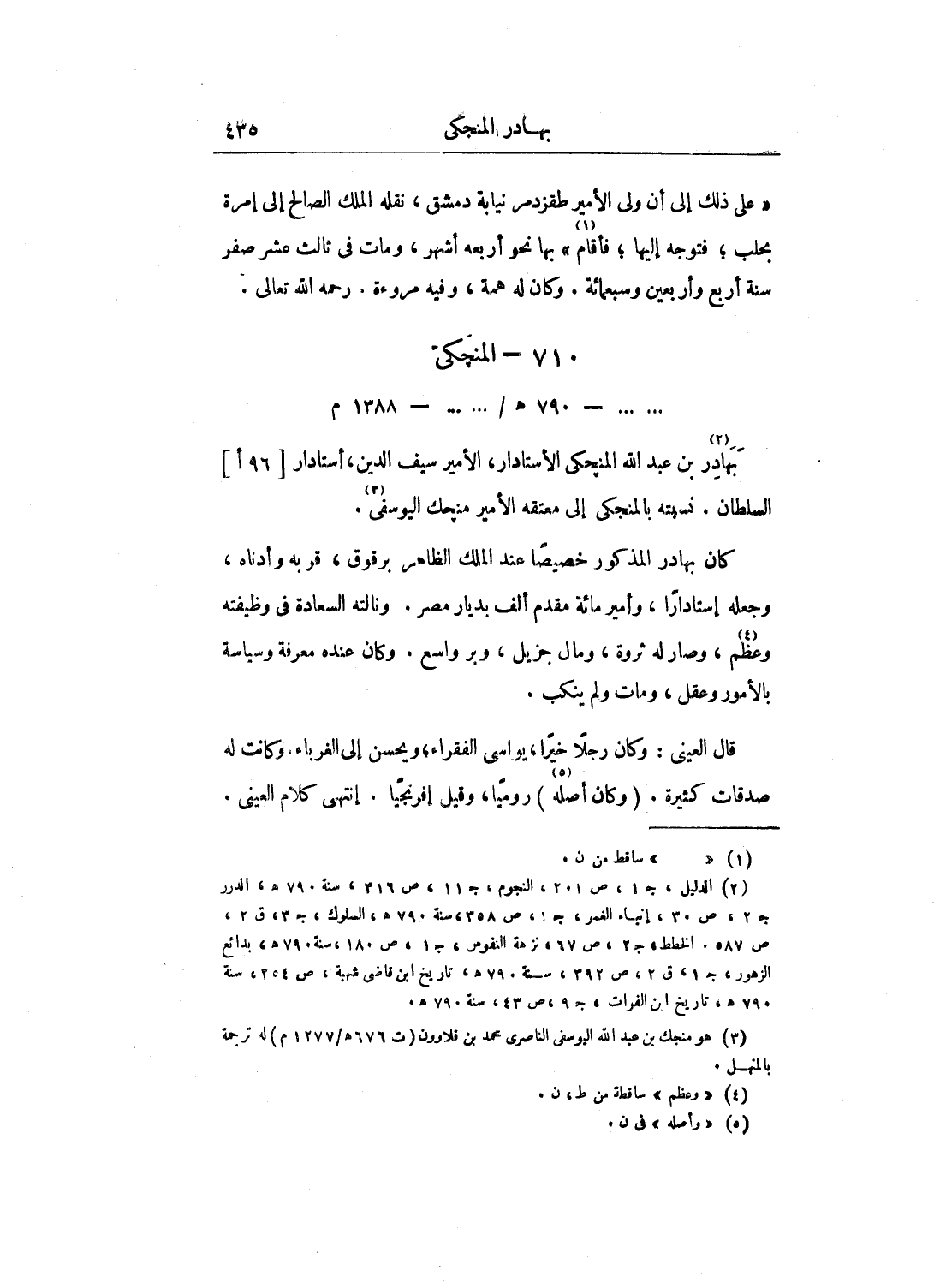 كان بهادر المذكور خصيصاً عند الملك الظاهر برقوق، قربه وأدناه، وجعله أستاداراً، وأمير مائة مقدم ألف بديار مصر. ونالته السعادة في وظيفته وعظم، وصار له ثروة، ومال جزيل، وبر واسع. وكان عنده معرفة وسياسة بالأمور وعقل، ومات ولم ينكب.