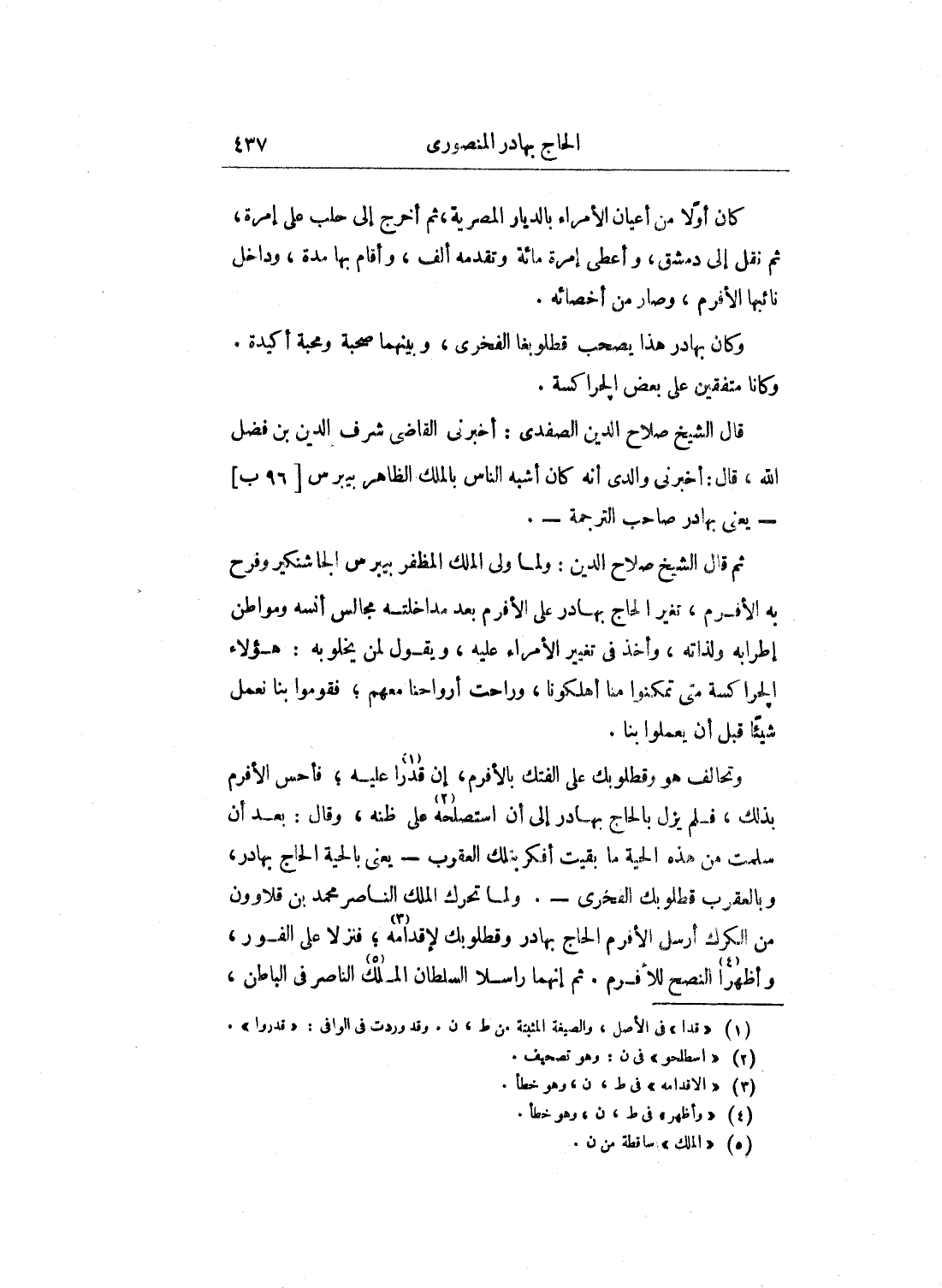 ثم قال الشيخ صلاح الدين: ولما ولى الملك المظفر بيبرس الجاشنكير وفرح به الأفرم، تغير الحاج بهادر على الأفرم بعد مداخلته مجالس أنسه ومواطن إطرابه ولذاته، وأخذ في تغيير الأمراء عليه، ويقول لمن يخلو به: هؤلاء اجلراكسة متى تمكنوا منا أهلكونا، وراحت أرواحنا معهم؛ فقوموا بنا نعمل شيئاً قبل أن يعملوا بنا.